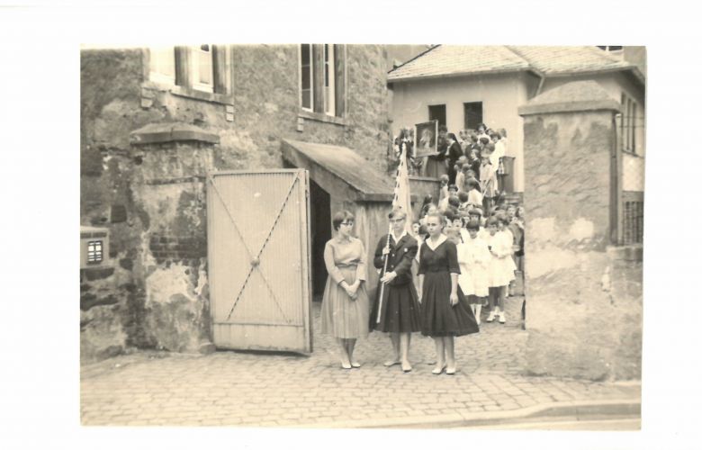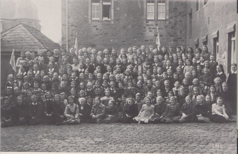 1949 - Ballspiel mit Sr. Salutis auf dem Pausenhof der Wildburg