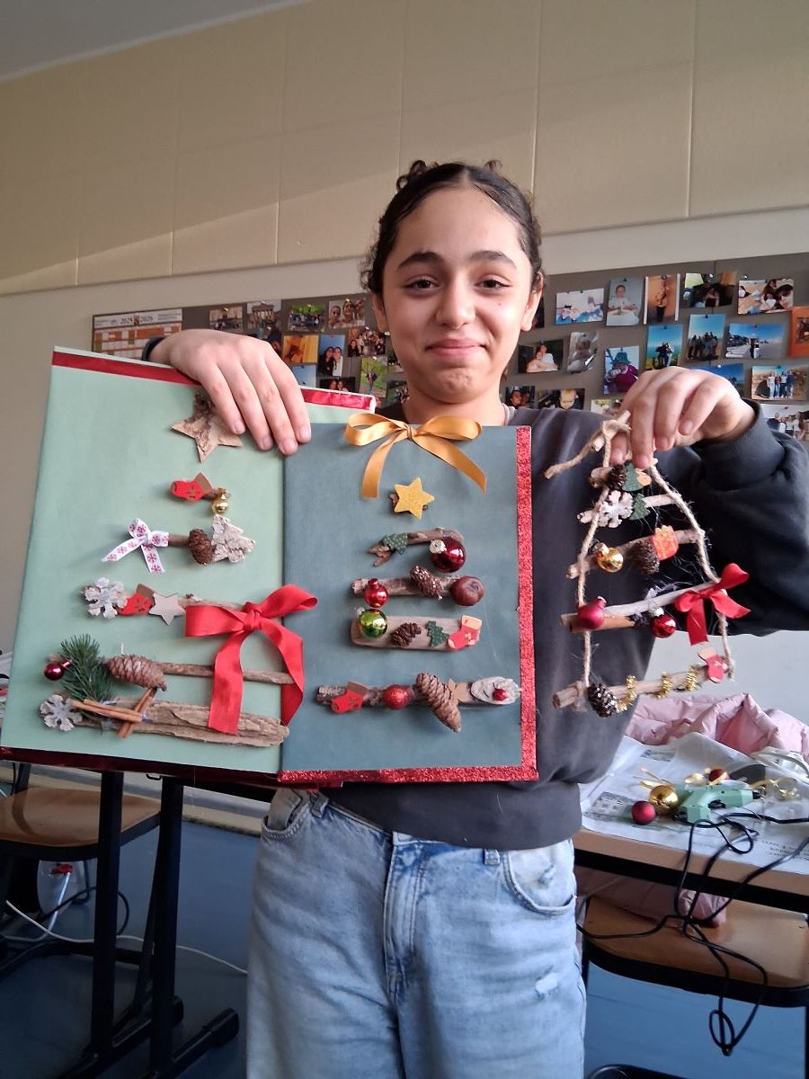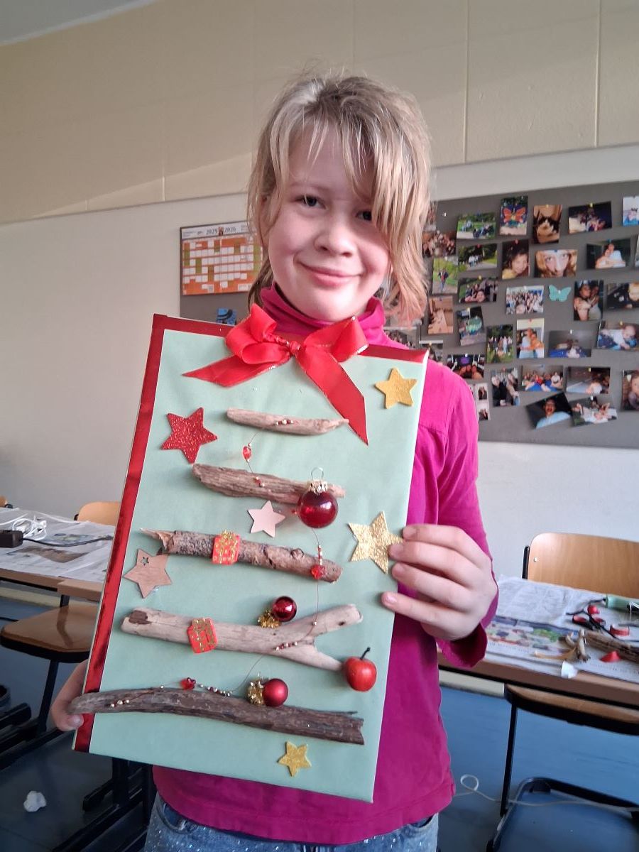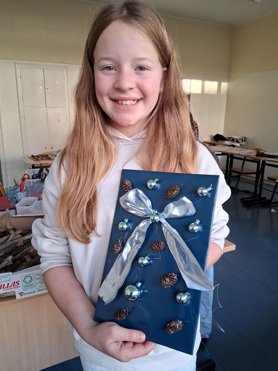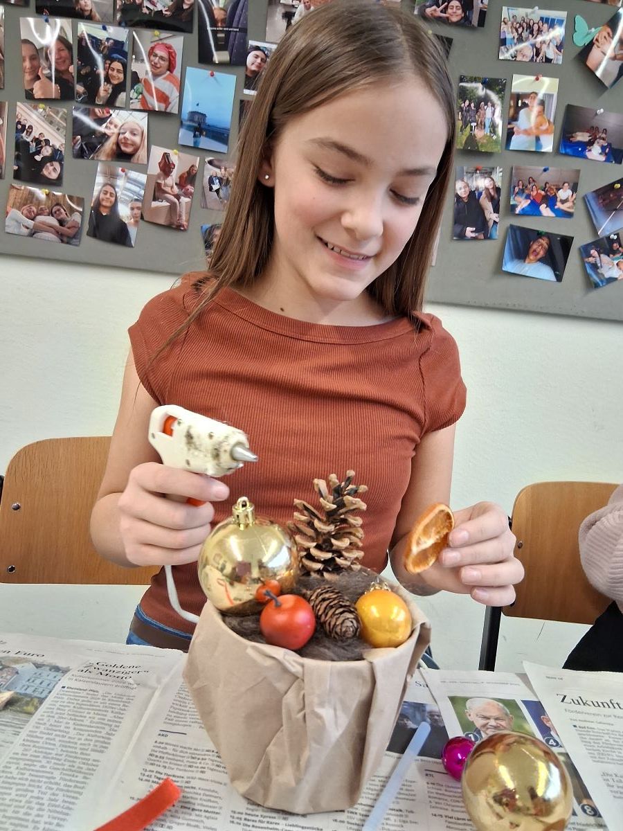 Im Garten der Schule ist ab November alles geerntet und es ist nass und kalt. Für die Garten-AG bedeutet dies, dass alle Aktivitäten nach drinnen verlegt werden. Zum Glück hat die AG einen großen Klassenraum zur Verfügung bekommen in dem man sich zu den vielen Bastelarbeiten ausdehnen kann. Marie-Luise Wenndorf hat immer neue Ideen für die Schülerinnen, wie sich schöne Herbst-Dekos und kleine selbst gebastelte Weihnachtsgeschenke herstellen lassen. Dazu stehen eine Fülle an Bastelmaterialien und zahlreiche Heißklebepistolen zur Verfügung, die besonders beliebt sind, auch wenn die Schülerinnen hier und da mit dem heißen Klebstoff an den Fingern in Berührung kommen. Mit viel Liebe werden die großen Schmuck-Dreiecke aus Haselruten ausgestaltet, da diese als Schmuck für die Schule vorgesehen sind. Zur Begeisterung der Schülerinnen können sie alle anderen Bastelarbeiten als Geschenke mit nach Hause nehmen.