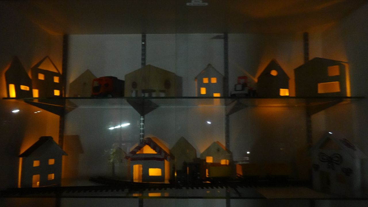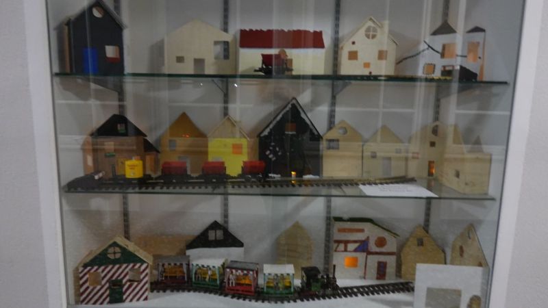 Die 6c und 6d haben in BK bei Frau von Zweydorff eigene Häuser gestaltet, aus Sperrholz ausgesägt und zusammengebaut mit Seitenteilen und Dach und angemalt- größenmäßig passend zur Garteneisenbahn, die dem Dorf Flair und einen Zusammenhalt gibt. Jeden Tag haben wir ein elektrisches Licht mehr angezündet, um die Adventszeit zu feiern.