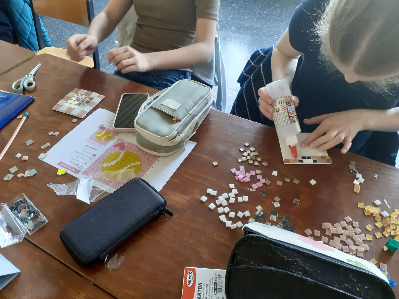 Nicht nur mit dem Würfelspiel beschäftigten sich die Lateinschülerinnen der 8c/d. Einen ganzen Schultag durften sie am 28.04.2026 den Alltag der Römer kennenlernen. Nachdem die Mädchen das Wichtigste über die Essgewohnheiten im alten Rom erfahren hatten, wurde sich beim selbstgestalteten Frühstücksbuffet gestärkt. Im Anschluss daran informierte ihre Lehrerin Frau Weißenfels sie über den römischen Kalender und die Zahlen. Das neu erworbene Wissen konnten sie dann in einem Quiz, das sie durch das ganzen Schulhaus zu einer "Schatzkiste" führte, unter Beweis stellen. Dann lernten die Schülerinnen die verschiedenen Berufe der Menschen im alten Rom kennen. In Anlehnung an die kunstvollen Verzierungen alter Gebäude stellten die Mädchen dann mit viel Geduld und Kunstfertigkeit eigene Mosaikbilder her. Zum Abschluss konnten sie selbst dann bei Pizza Spiele ausprobieren, die die Menschen schon vor 2000 Jahren zum Zeitvertreib spielten. Ein kurzweiliger Tag mit vielen neuen Erkenntnissen!