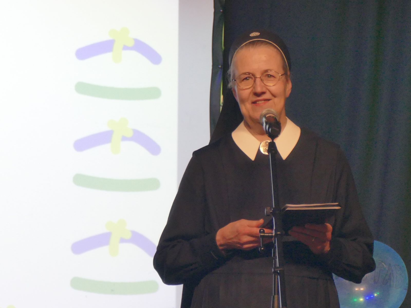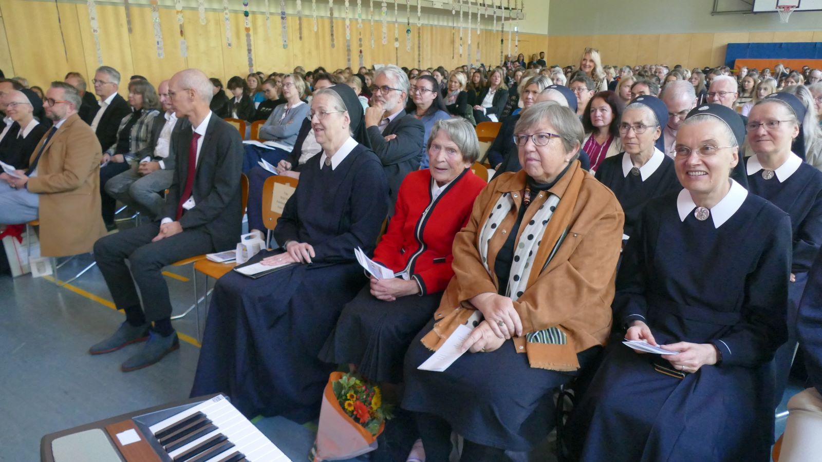 Schwester Marisa Spickers, als Vertreterin des Schulträgers, wandte sich – einen Tag nach dem Weltaltentag – an die Mädchen und jungen Frauen: „Unsere Schule ist auch alt, 80 Jahre alt, aber ihr erhaltet sie jung.“ Aus kleinsten Anfängen mit wenig Klassen, beschränkten Räumen, leidlich ausgebildeten Lehrerinnen und Lehrern sei eine moderne Schule geworden, eine geschätzte Institution in der Region mit zwei Schulzweigen, zwei Freundeskreisen, Elterngremien, dem Verein Ehemalige und qualifizierten und herausragend engagierten Lehrern, denen sie allen herzlich danke.