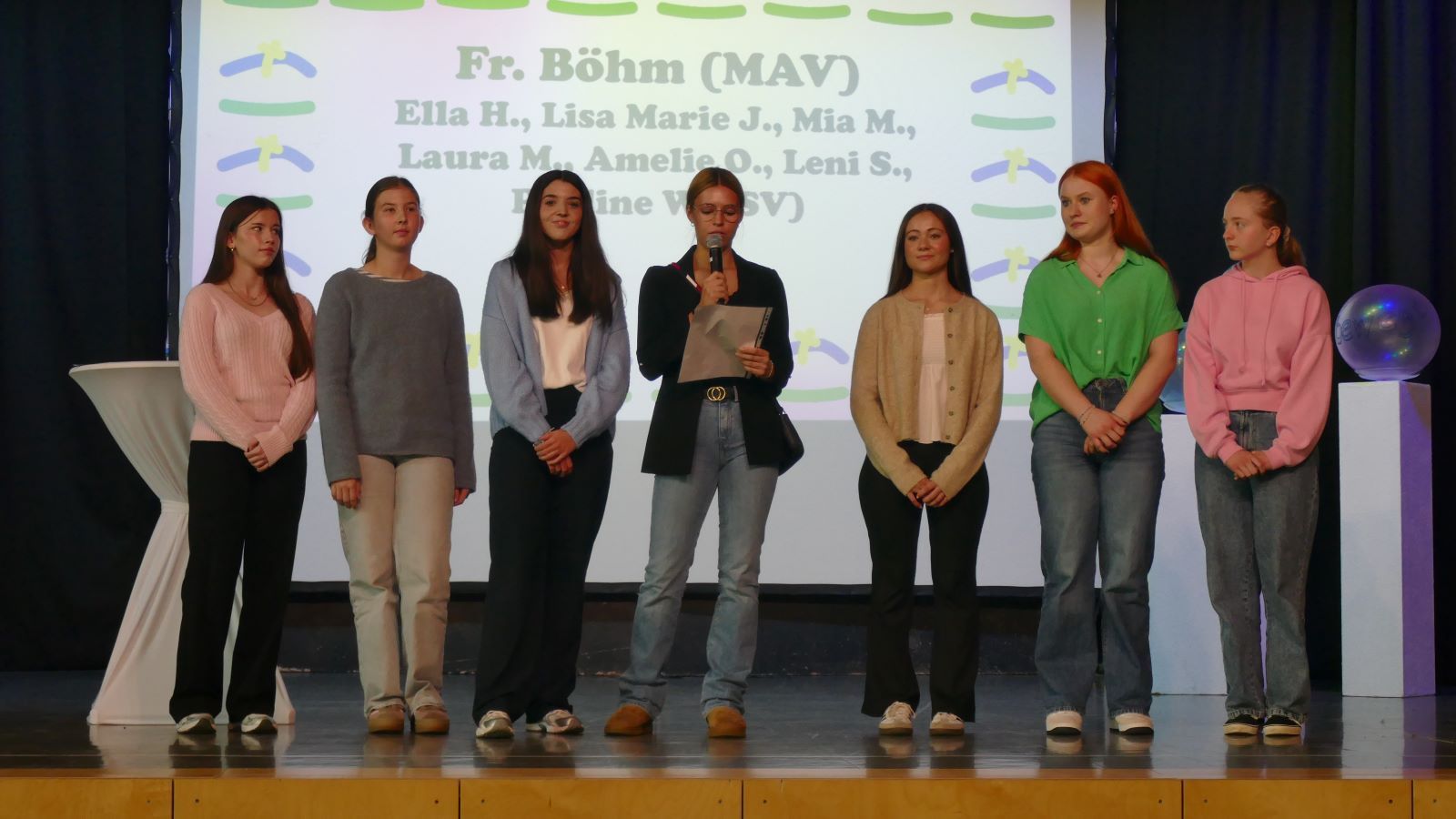 Die sieben frisch gewählten Schülersprecherinnen gratulierten abschließend ebenfalls ihrer Schule und setzten, wie sie betonten, ein Zeichen für die Zukunft. Sie überreichten den beiden Rektorinnen der zwei Schulzweige, Sr. M. Gabriele Schreck und Frau Rasine Luß einen Apfelbaum, auf dass die Schulgemeinschaft weiterwachse, wie dieser Baum und reiche Früchte trage. „Auf die nächsten 80 Jahre!“