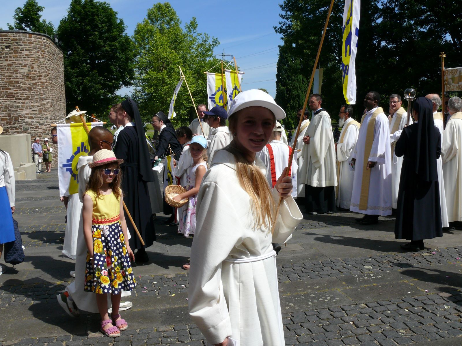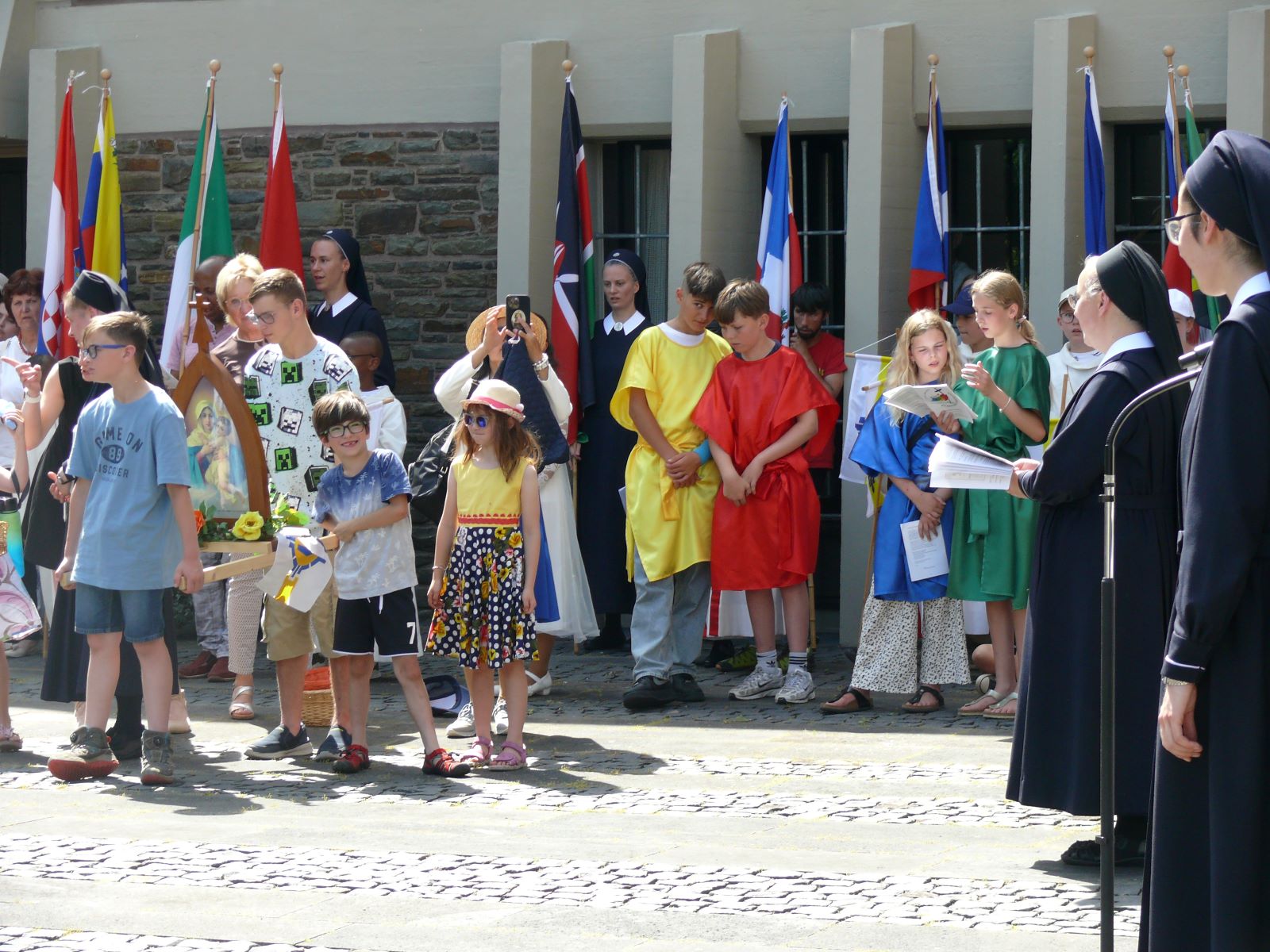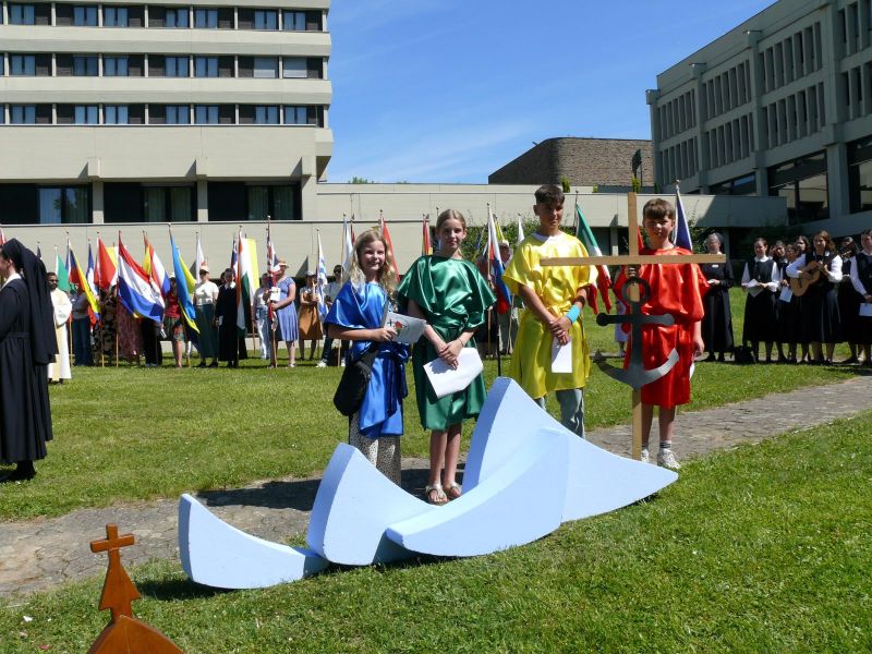 Für die große Fronleichnamsprozession am 22.06.2025 haben am Vortag viele Helferinnen und Helfer auf Berg Schönstatt Blumenteppiche gelegt. Am Sonntag trugen Kinder am dritten Altar die Fürbitten vor. Ihre Texte waren in diesem Jahr abgestimmt auf das Motto des Heiligen Jahres, "Pilger der Hoffnung". Unter den vier Kindern, die in Gewändern des Jubilumslogos gekleidet agierten, war eine Schülerin der SMS. Auch bei den Messdienerinnen und Fahnenträgerinnen waren Marienschul-Schülerinnen aktiv.
