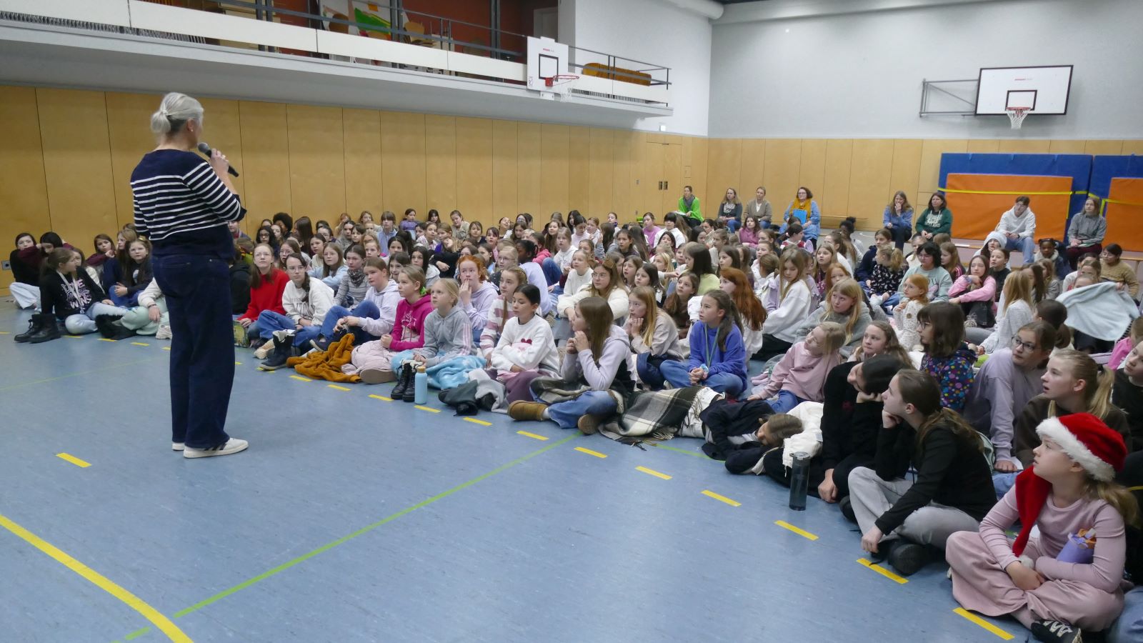 Die erste Schulstunde kerngesund in eine kuschlig warme Decke gehüllt und auf einem Kopfkissen gebettet zu genießen – das ist vielleicht der Traum so mancher Schülerin. Wer wollte, konnte ihn am 05.12.2025 wahrmachen und im Liegen die letzte Runde des Vorlesewettbewerbs auf Schulebene verfolgen. Die meisten Schülerinnen saßen jedoch, weil sie so besser mitfiebern konnten mit ihrer Klassenkameradin, die im Schulentscheid um die Wette lesen würde. Frau Blatt begrüßte das große Auditorium. Frau Luß gratulierte den Klassensiegerinnen - aus der 6a: Pina Sch., der 6b: Amelie Claire L., der 6c: Clara Christ und der 6d: Paulina B. und überreichte ihnen eine Urkunde sowie eine Präsenttasche.