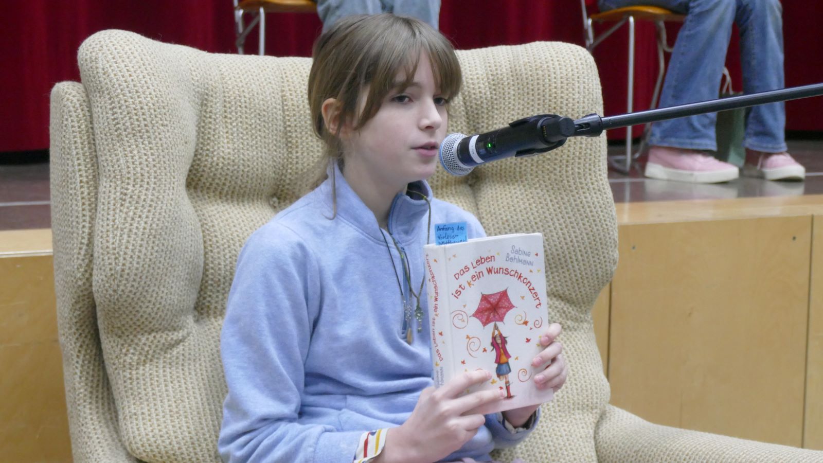 Dann wurde es so richtig spannend. Nacheinander wechselten die Klassensiegerinnen auf den großen Vorlesesessel, der – leicht erhöht – vorne in der Aula stand und lasen aus dem Roman ihrer Wahl eine ausgewählte Textstelle vor. Die acht Klassen der Unterstufe hatten an jenem Freitagmorgen ein spannendes und heiteres Lektüreerlebnis, denn die Schülerinnen lasen wirklich gut.