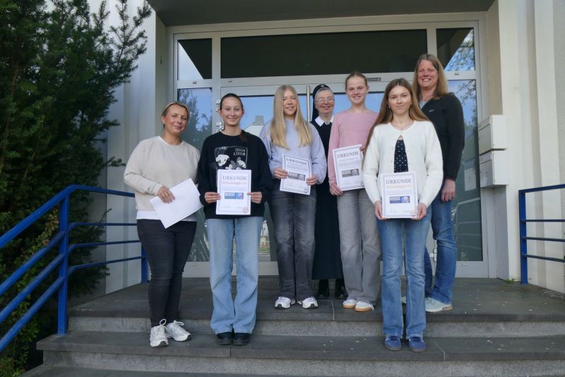 Kirsten Helfer (Fachschaftsleitung Erdkunde Realschule plus), Ronja M. (Schulsiegerin Realschule plus), Marieke K. (Klassensiegerin 7c), Sr. Gabriele (Schulleiterin), Luisa S. (Klassensiegerin 7d), Charlotte P. (Schulsiegering Gymnasium), Tanja Franke (Fachschaftsleitung Erdkund Gymnasium)
