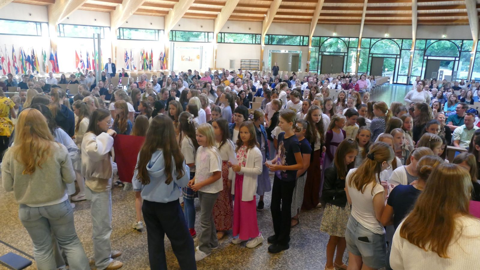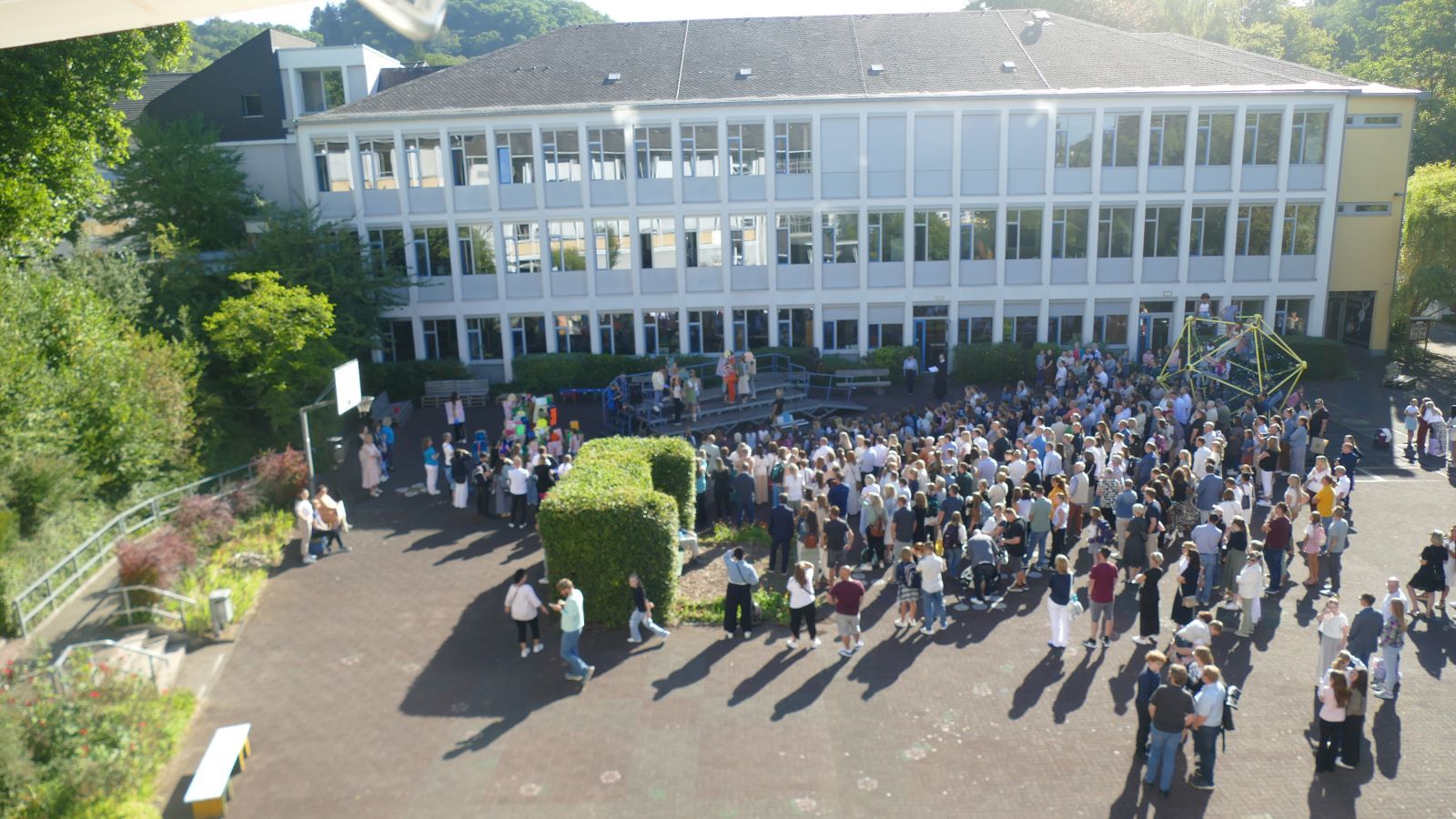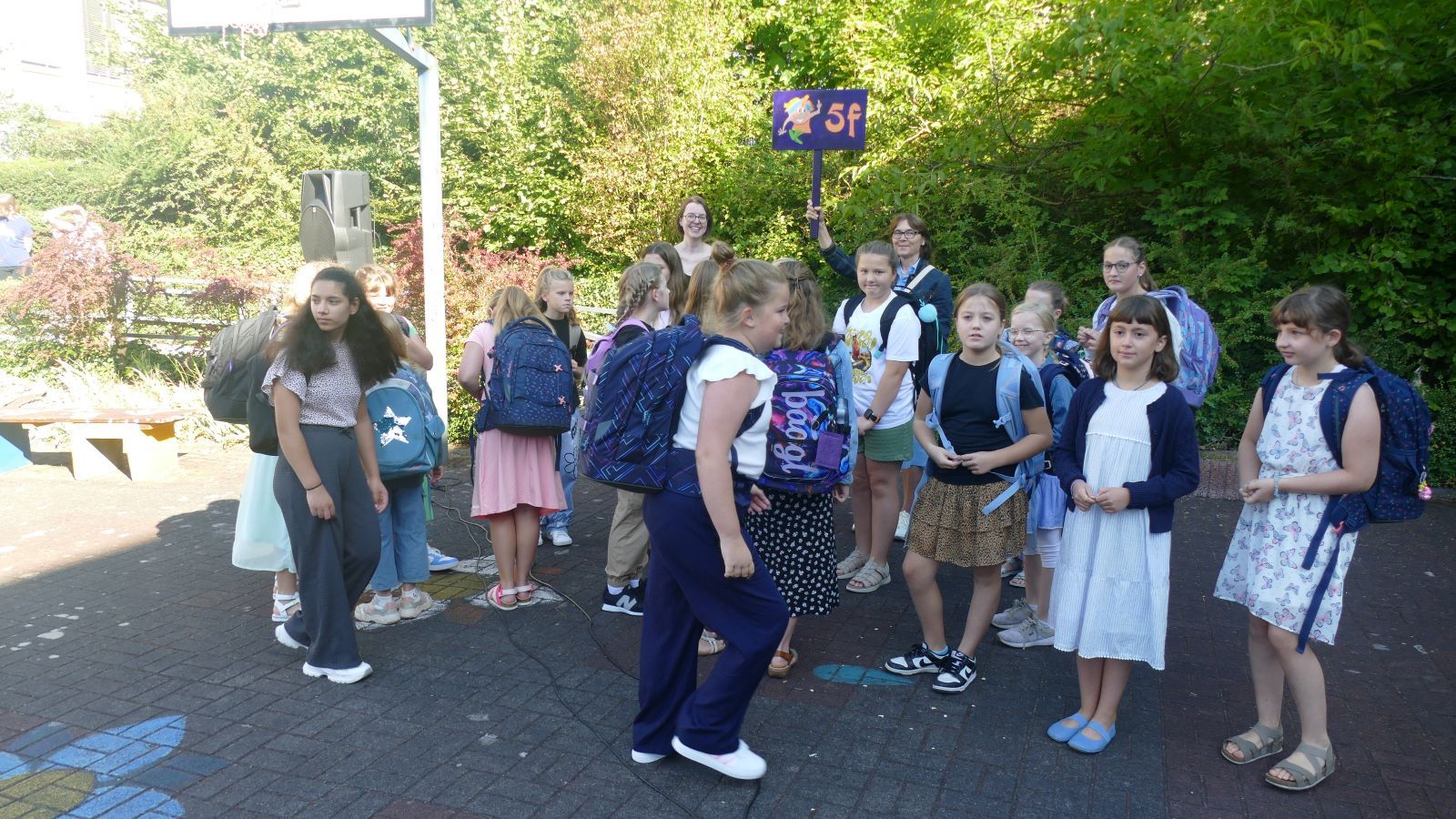 Nach dem Einschulungsgottesdienst trafen sich alle auf dem unteren Schulhof der Schönstätter Marienschule wieder. Dort wurde den Fünfern und ihren Angehörigen ein buntes Bühnenprogramm geboten. Zu Beginn der Darbietung stellte sich Frau Luß, die Leiterin der Realschule plus, vor. Sr. M. Gabriele, Schulleiterin der Marienschule, hatte bereits am Ende des Gottesdienstes zu allen gesprochen.