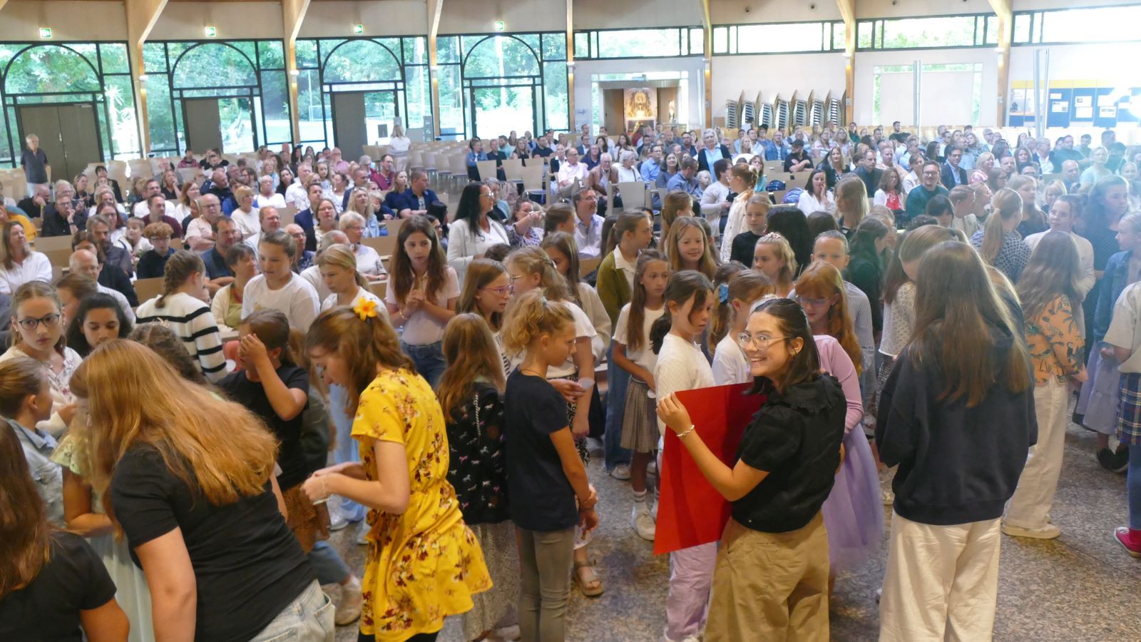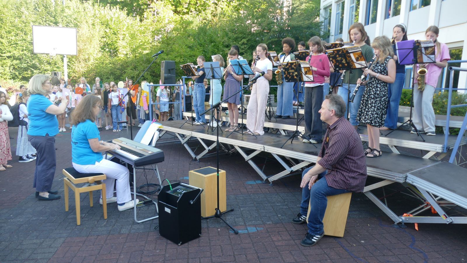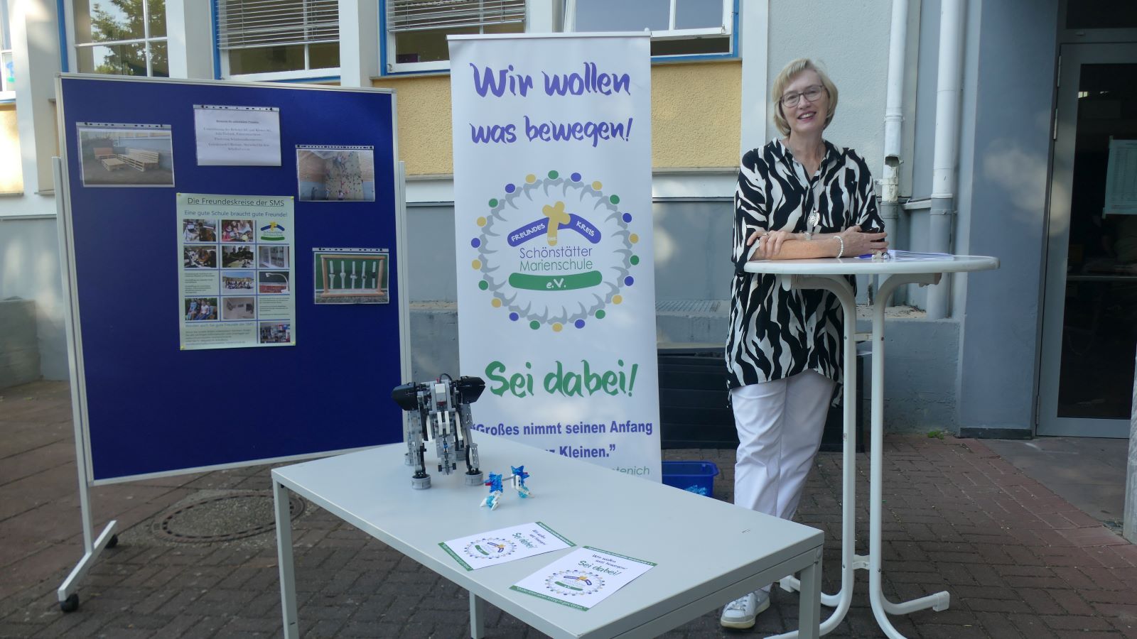 Nach dem Einschulungsgottesdienst trafen sich alle auf dem unteren Schulhof der Schönstätter Marienschule wieder. Dort wurde den Fünfern und ihren Angehörigen ein buntes Bühnenprogramm geboten. Zu Beginn der Darbietung stellte sich Frau Luß, die Leiterin der Realschule plus, vor. Sr. M. Gabriele, Schulleiterin der Marienschule, hatte bereits am Ende des Gottesdienstes zu allen gesprochen.