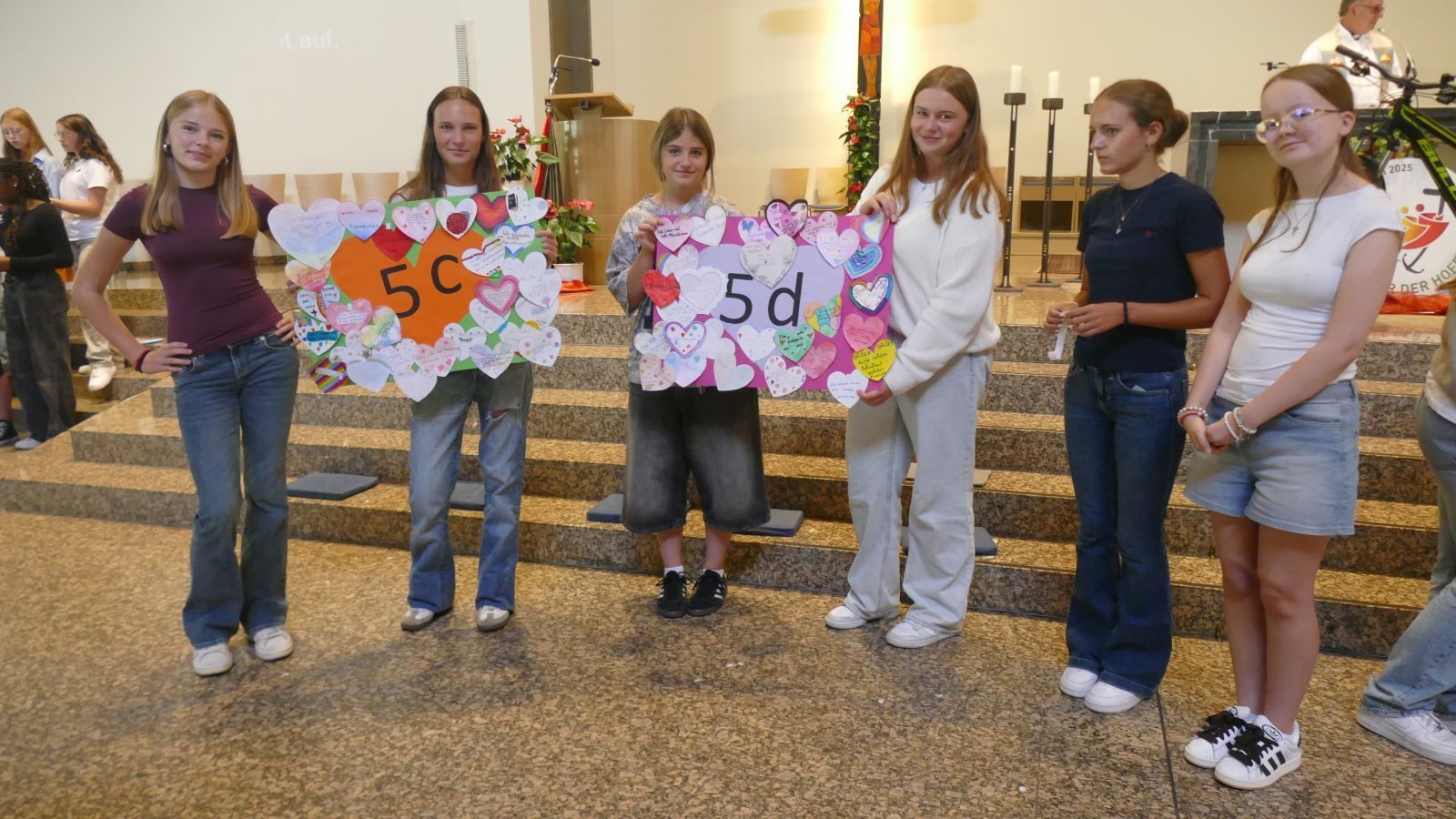 Ein Höhepunkt des Einschulungsgottesdienstes, dem Pater José Luis Carrera Lira vorstand, war das Festmachen des persönlich gestalteten Papierherzens auf einem Plakat der neuen Klasse. 130 „Herzenswünsche“ der neuen Schülerinnen wurden auf diese Weise zusammengetragen und sind nun an der Pinnwand im jeweiligen Klassenzimmer zu lesen.