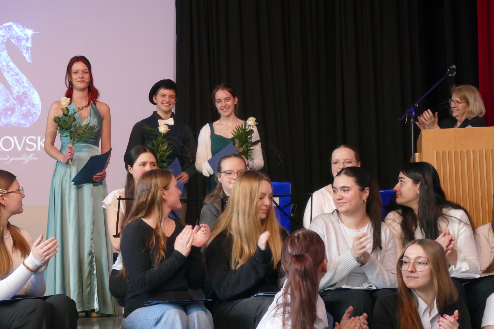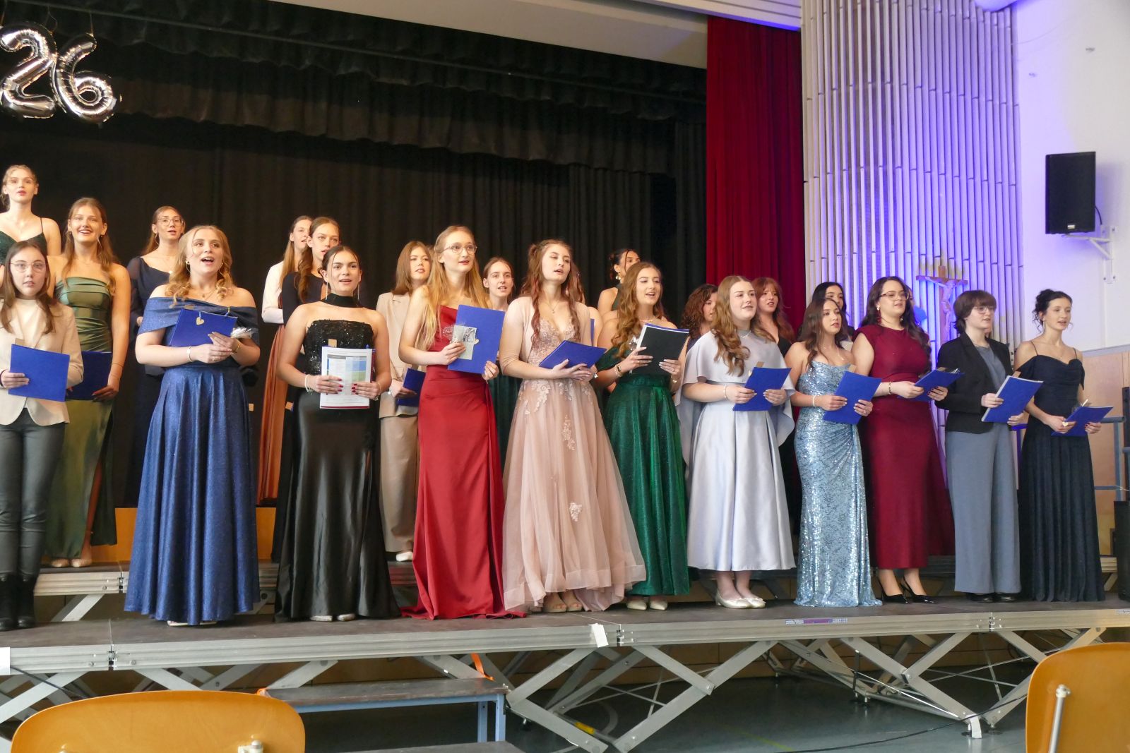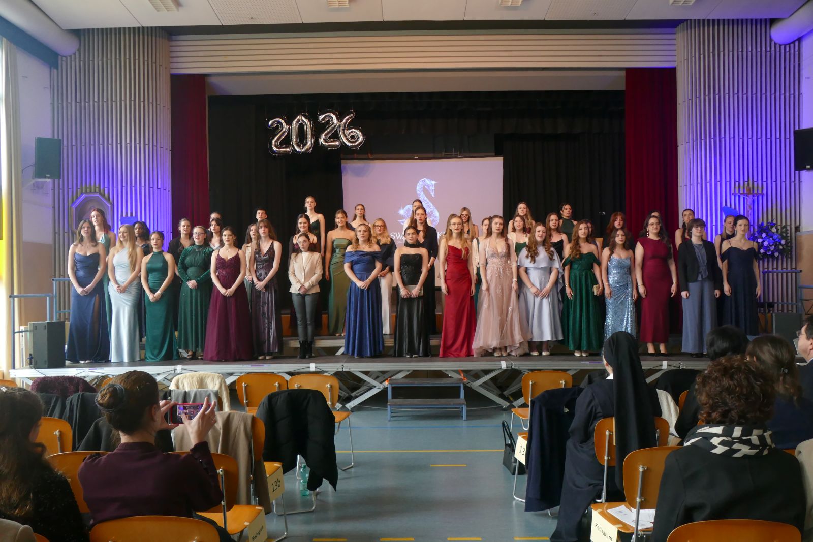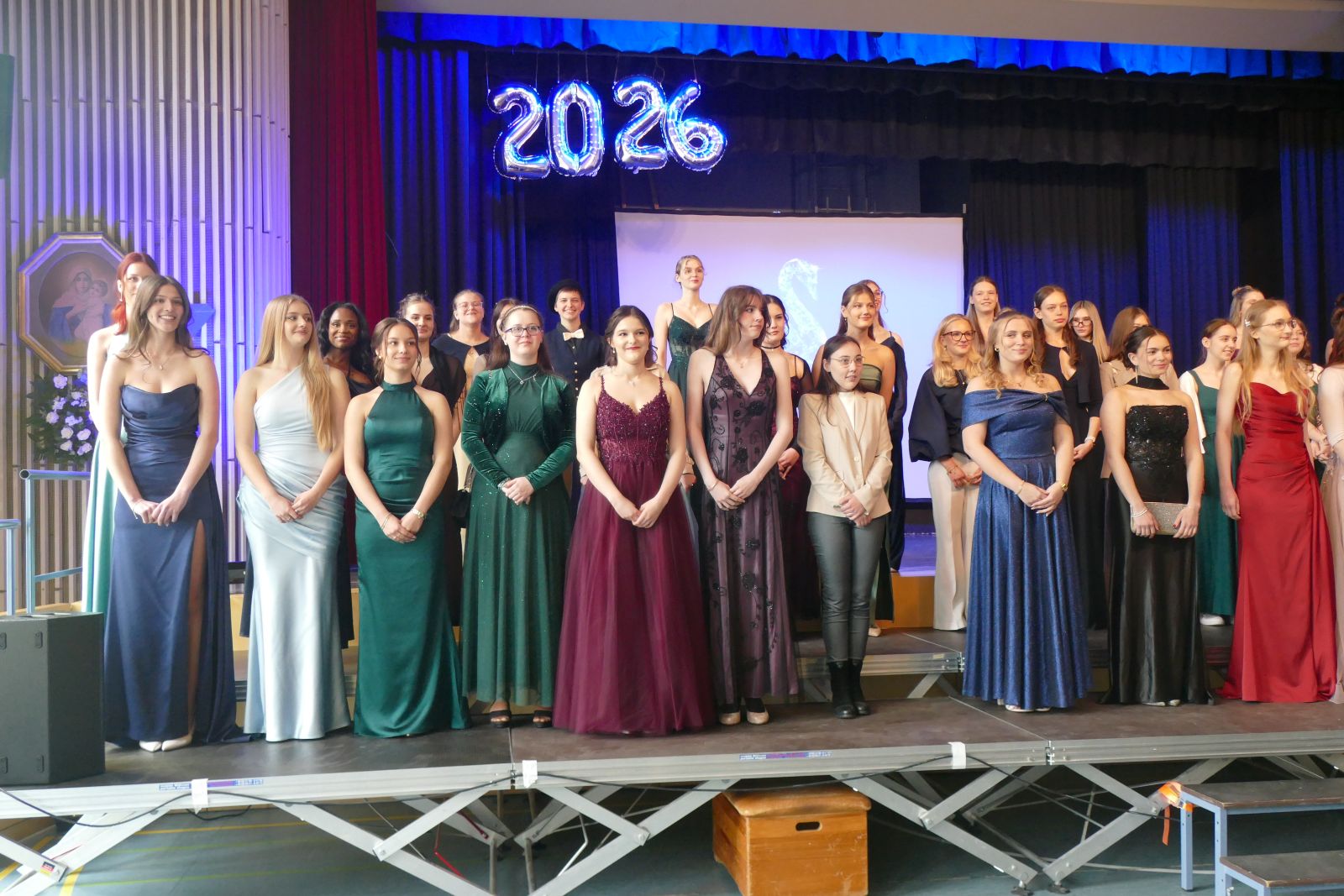 Nach dem Abiturgottesdienst wurde die Feier am 27.03.2026 in der Aula der Marienschule fortgesetzt. Zur Einstimmung präsentierten die Stammkurslehrerinnen Frau Bürger und Sr. Christamaria eine eigens zum Abimotto „Swabirovski – Die Diamanten sind geschliffen“ generierte effektvolle Filmouvertüre. Daraufhin zogen die Abiturientinnen glamourös in die Aula ein und nahmen auf der Bühne Aufstellung. Dort trugen sie ihr sogenanntes „5er-Lied“ vor, mit dem sie sich vor fast neun Jahren der Schulgemeinschaft vorstellten.