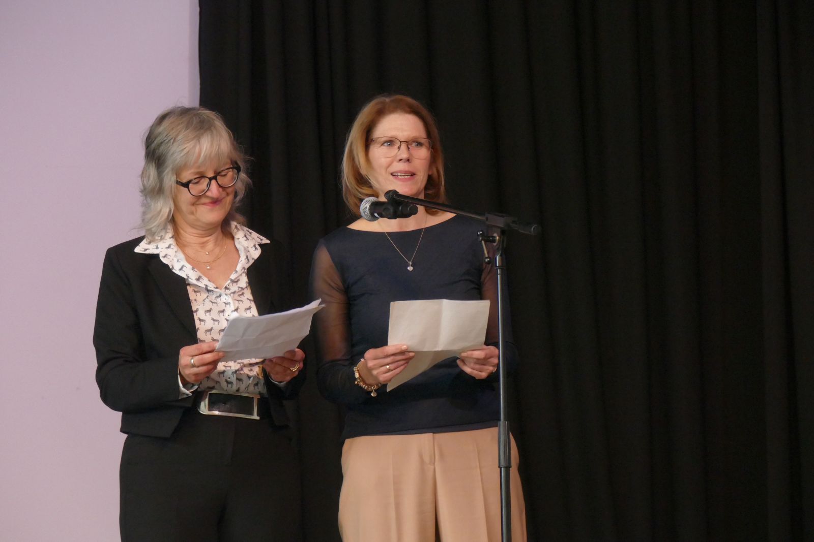 In einer Rede voller Esprit und Humor gaben die Jahrgangseltern, Frau Faust und Frau Völkel, Blitzlichter aus der Unter-, Mittel- und Oberstufe aus der Perspektive von Müttern zum Besten. Sie dankten der Schule für die Wissens- und Wertevermittlung und wandten sich am Ende an die jungen Frauen: „Wir sind sicher, ihr werdet glänzen.“