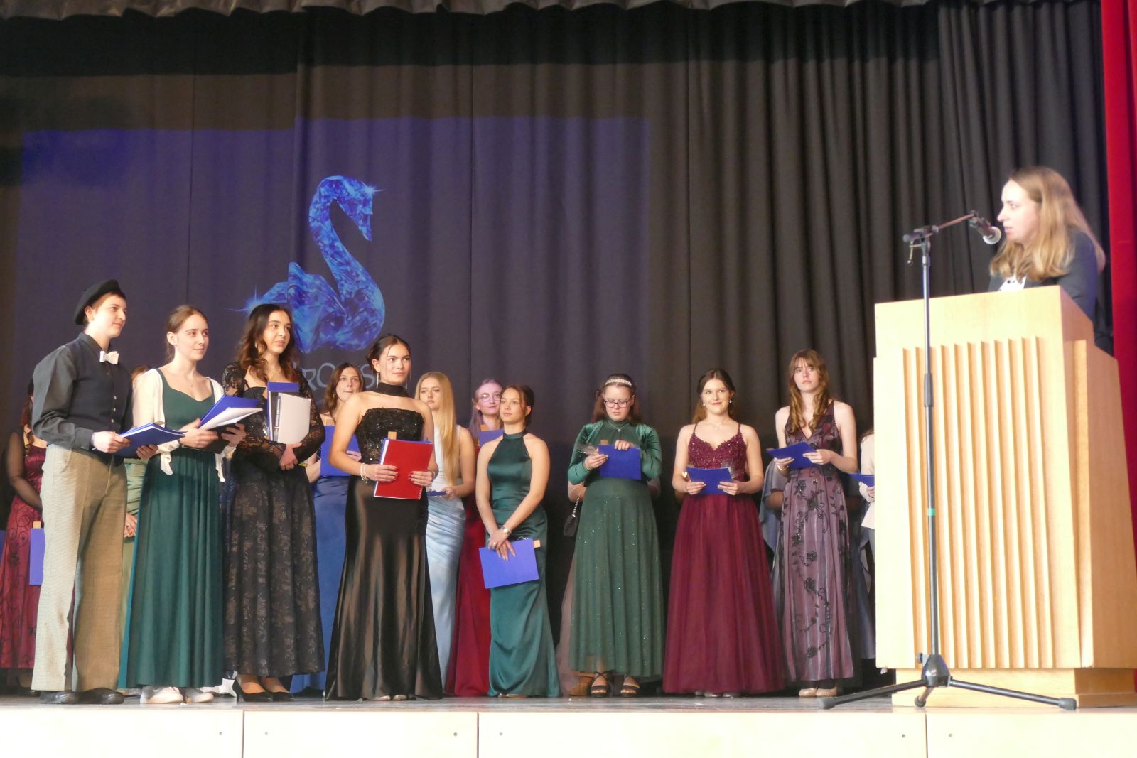 In einem Grußwort dankten die Schülersprecherinnen dem Abiturjahrgang für alles, was er für die Schule eingesetzt hat. Sie wünschten „Mut, Erfolg und viele Momente, die genauso glänzen wie der heutige Tag“.