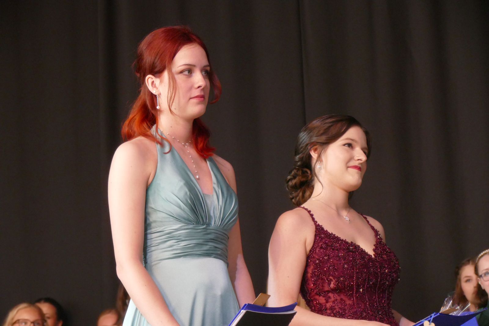 Aurelia L. und Marie St. standen für den Abiturjahrgang am Mikrophon. Sie hielten Rückschau auf die Jahre, die sie gemeinsam verbracht hatten – mit Höhen und Tiefen, Auf und Ab. Sie seien stolz auf ihre Entwicklung, auch wenn es nicht immer leicht gewesen sei, und dankten ihren Mitschülerinnen und guten Freunden, den Eltern für ihre Unterstützung und den Lehrkräften für ihre Geduld. Besonders hoben sie das unermüdliche Engagement ihrer Stammkurslehrerinnen Frau Bürger und Sr. Christamaria und das der Oberstufenleiterin Frau Speier hervor. Sie hätten ihnen mit Rat und Tat zur Seite gestanden und sie in der Oberstufenzeit stets begleitet. Mit Hoffnung und Zuversicht würden sie jetzt in die Zukunft schauen.