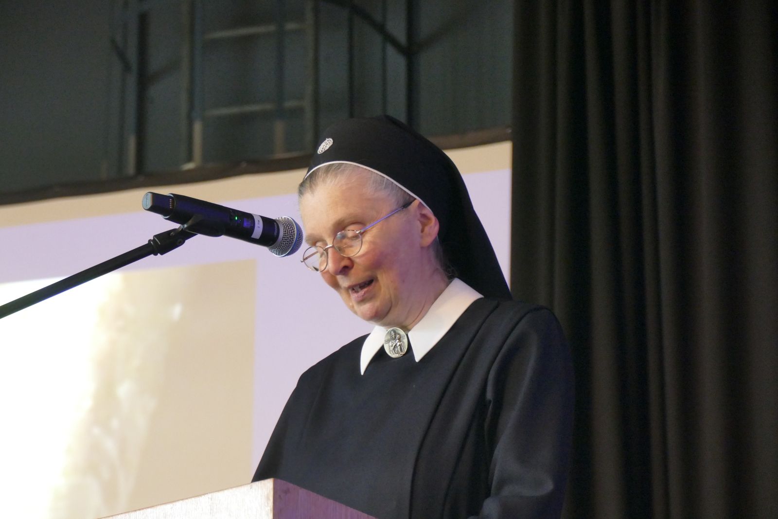 Vor der Geräuschkulisse einer Edelsteinschleiferei begann Sr. M. Gabriele ihre Rede und verdeutlichte so, dass es Arbeit macht, bis aus einem Rohdiamanten Schmuckstücke würden, wie sich die Abiturientinnen jetzt darstellten. Alles beginne mit der korrekten Einschätzung des Steins, dann ginge es weiter mit dem perfekten Schliff. Sr. M. Gabriele dankte den Eltern, die das große Potential ihrer Töchter erkannt hätten und sie als „kostbare Edelsteine“ der Marienschule anvertraut haben. Dass danach ein geeigneter Schliff zeit- und kraftaufwändig sei, wisse jeder, der mit Diamanten zu tun habe. Da es sich bei einem Diamanten um das härteste Naturmaterial der Welt handele, sei ein anderer Diamant für den Schleifvorgang nötig. Wie ein Diamant den anderen schleift, könne man im Schulalltag erfahren. Der strahlende Glanz sei – so Sr. M. Gabriele – auch das Ergebnis der eigenen Mitwirkung im Spiel der Kräfte und Reibungen. Die Schulleiterin dankte für den Einsatz der Abiturientinnen in der Schulgemeinschaft z.B. bei Auftritten von Chor und Orchester, bei der Mitarbeit in sozialen Projekten, im sportlichen und im MINT-Bereich, im Technik-Team, in der Podcast-AG und vielem mehr. „Das alles sind schöne Facetten eures Hier-Seins. Wir schätzen euren Einsatz hoch“, sagte sie. Aus jedem Stein sei ein einzigartig origineller Schmuckstein geworden. Sr. M. Gabriele stellte einige Schliffkategorien vor: den Brillanten, den Princess-Schliff, den Kissen- und Smaragdschliff und schließlich den Herzschliff, der besonders anmutig sei. Sie stellte Maria als besonders geschliffene Frau dar, die ein bereites und mutiges Ja gesprochen und das Licht aufgenommen habe. Sr. M. Gabriele sagte, dass Maria auch den Abiturientinnen das Licht erbitte und wünschte ihnen, dass ihr Glanz nicht erlösche. Abschließend rief sie ihnen zu: „Die Welt braucht euch und hat Menschen mit positiver Ausstrahlung nötig.“