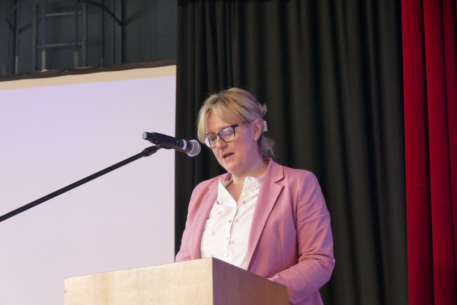 Auch die MSS-Leiterin Frau Speier griff das Bild vom Diamanten auf und zog Parallelen zum Werdegang und Schulalltag der Abiturientinnen, die nun in die Welt hinausgingen, mit einer Ausbildung oder einem Studium beginnen würden. Sie überreichte ihnen ein Geschenk als Zeichen, dafür, dass sie außerhalb der Schule weiterwachsen dürften, wertvoll seien und die Welt mit ihrem Funkeln erhellen mögen.