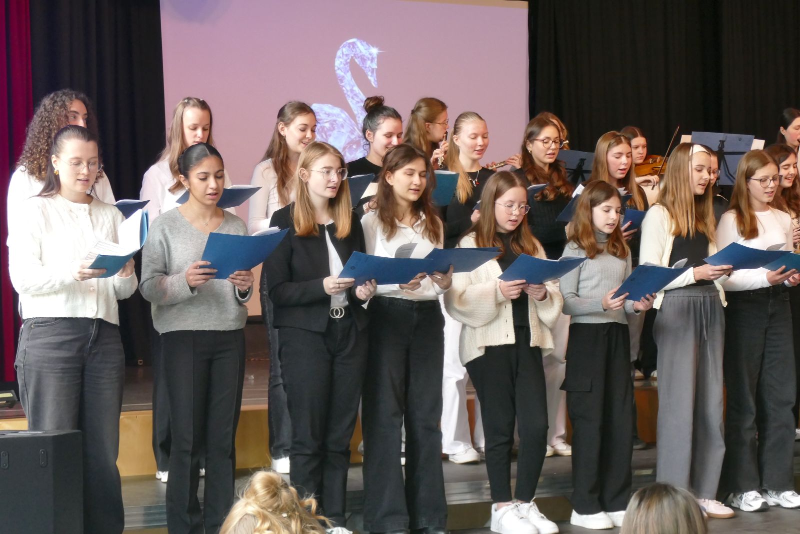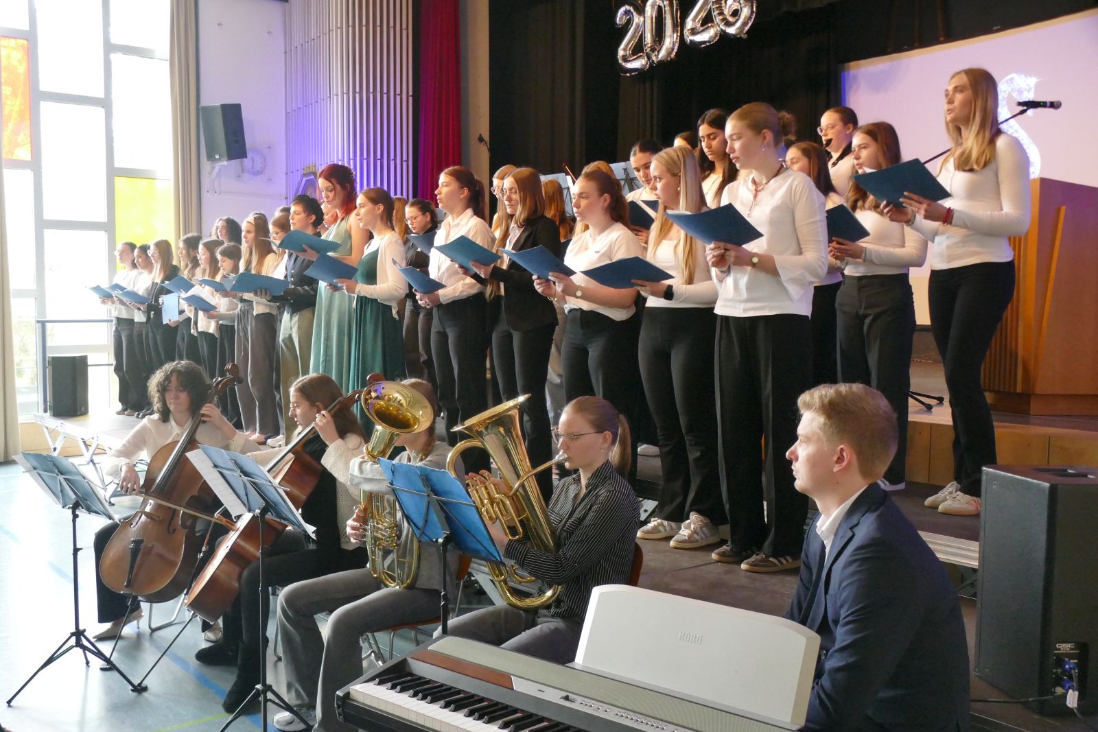 Schulchor und Orchester unter der Leitung von Frau Jocks intonierten das Stück „Sapphire“ von Ed Sheeran. Frau Jocks verabschiedete im Namen und mit Worten von Frau Maasri langjährige, zuverlässige und engagierte Chor-Mitglieder.
