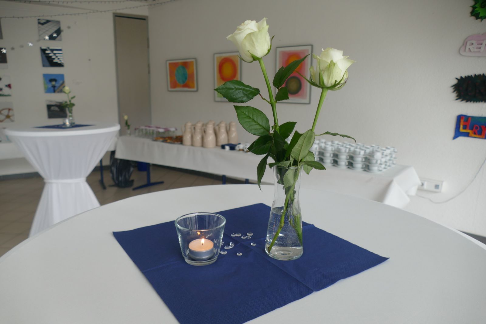 Während der Feierlichkeiten hatten sich die Schülerinnen der MSS 12 zusammen mit ihren Stammkurslehrerinnen um das leibliche Wohl der Festgesellschaft gekümmert. Für den Sektempfang im Wintergarten war alles bereitet. Weiße Rosen und Diamanten zierten die Tische.