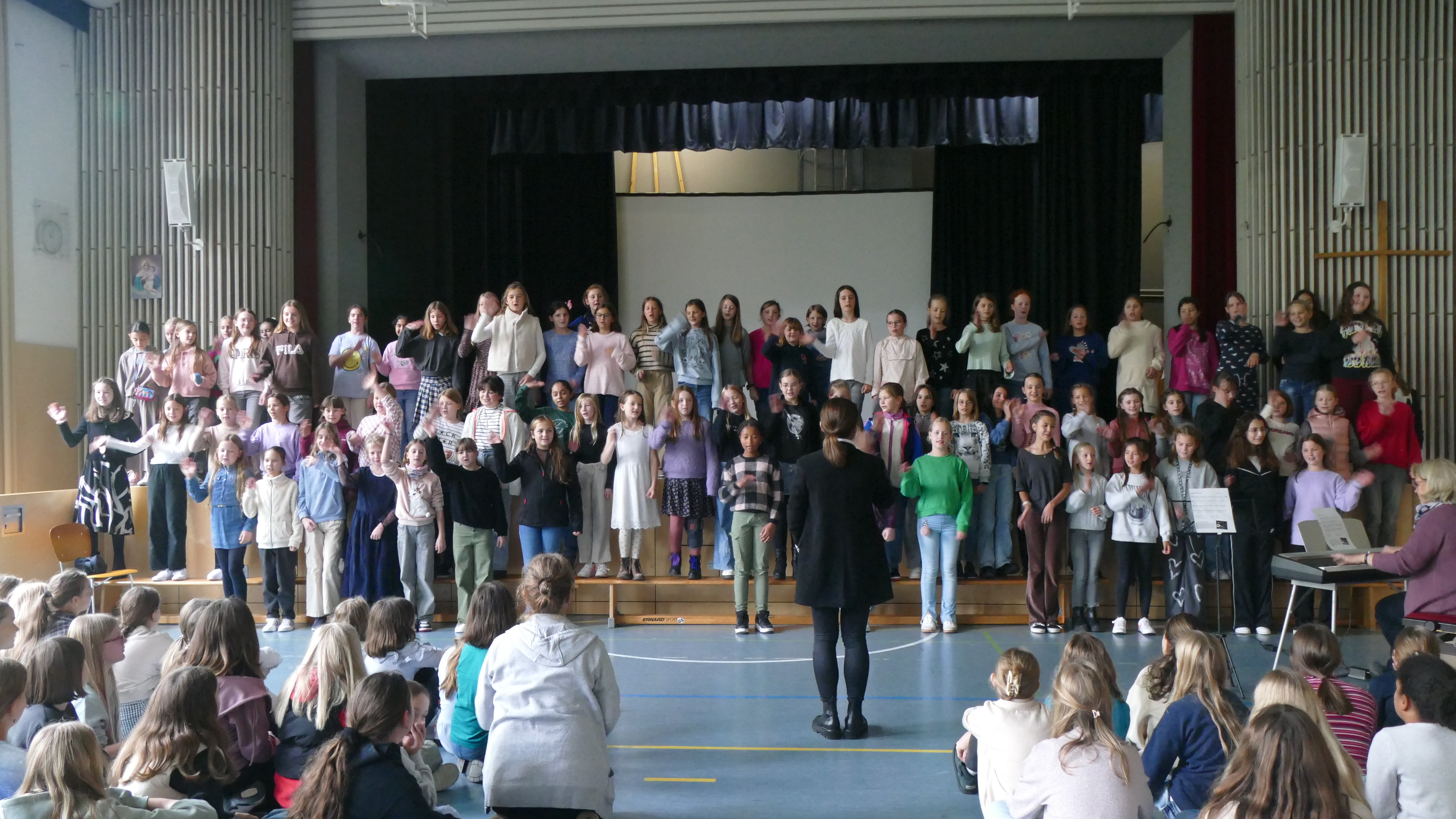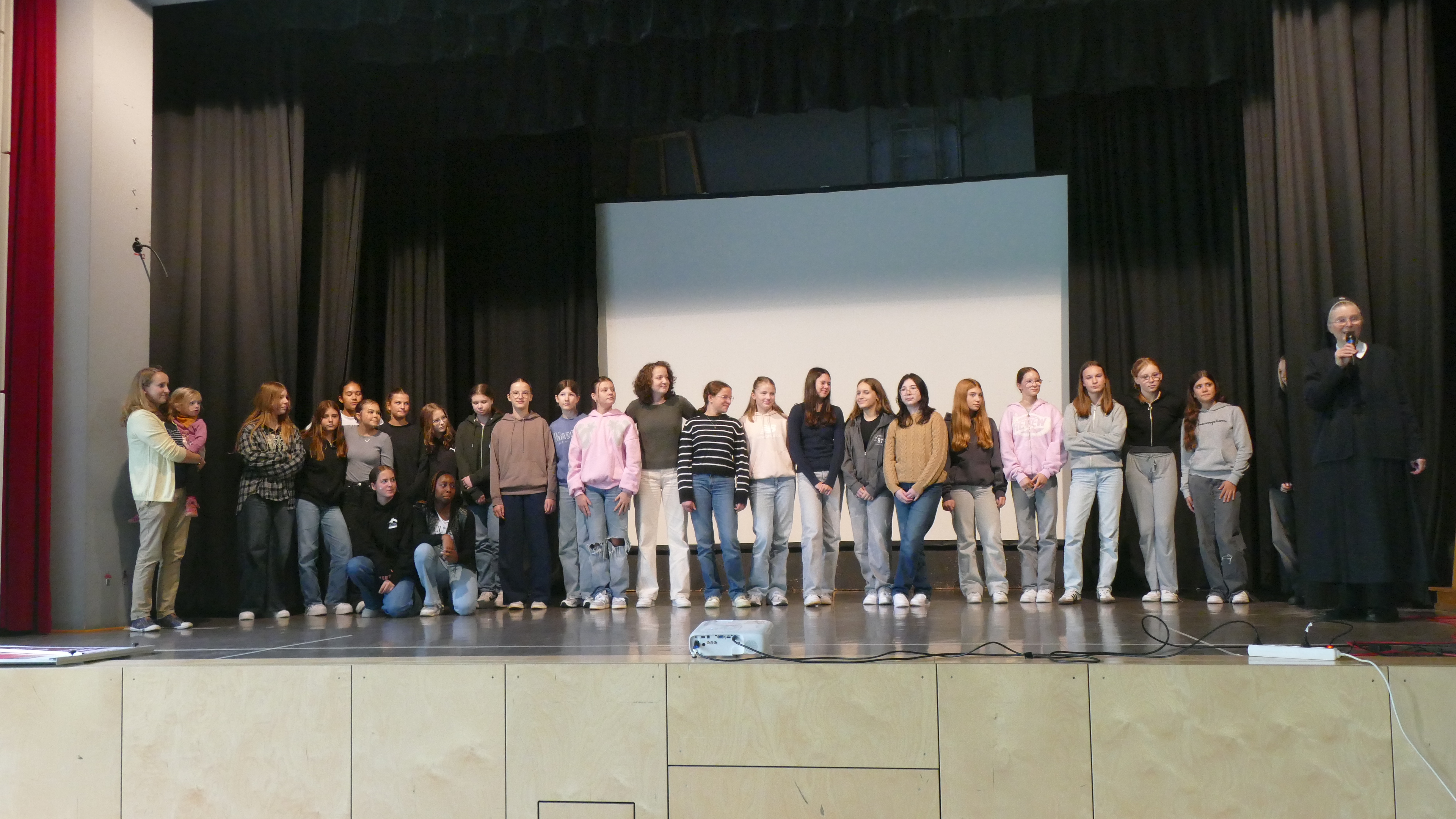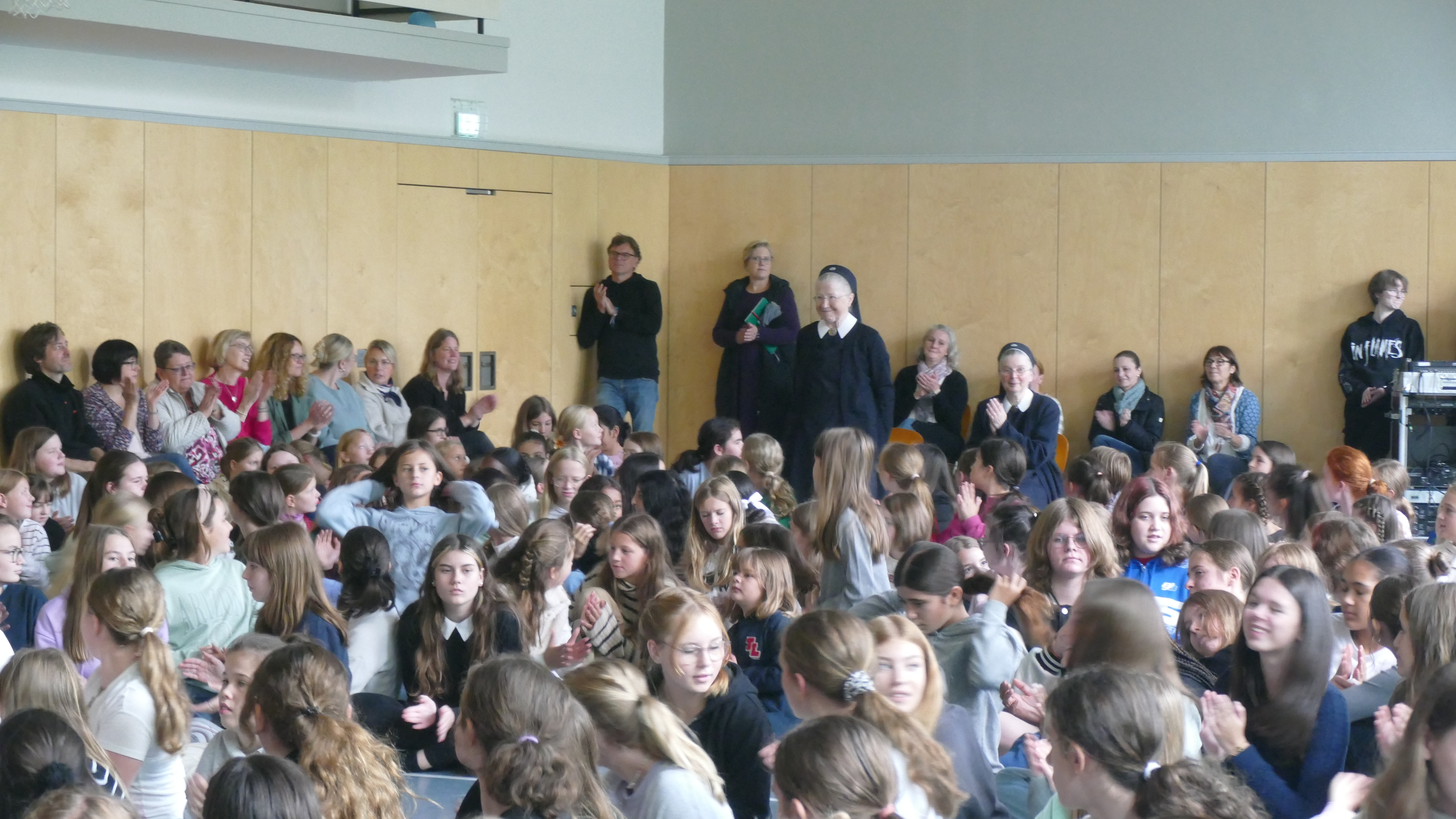 Nach dem großen Gottesdienst zum Schulgeburtstag in der Pilgerkirche in Schönstatt begaben sich die Klassen 9-13 in die Aula, während die jüngeren Schülerinnen zu Klassenaktivitäten zusammenkamen.