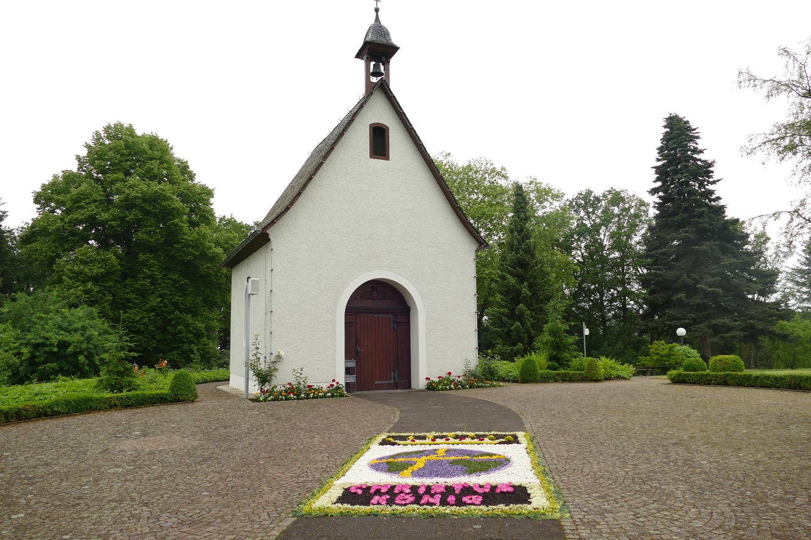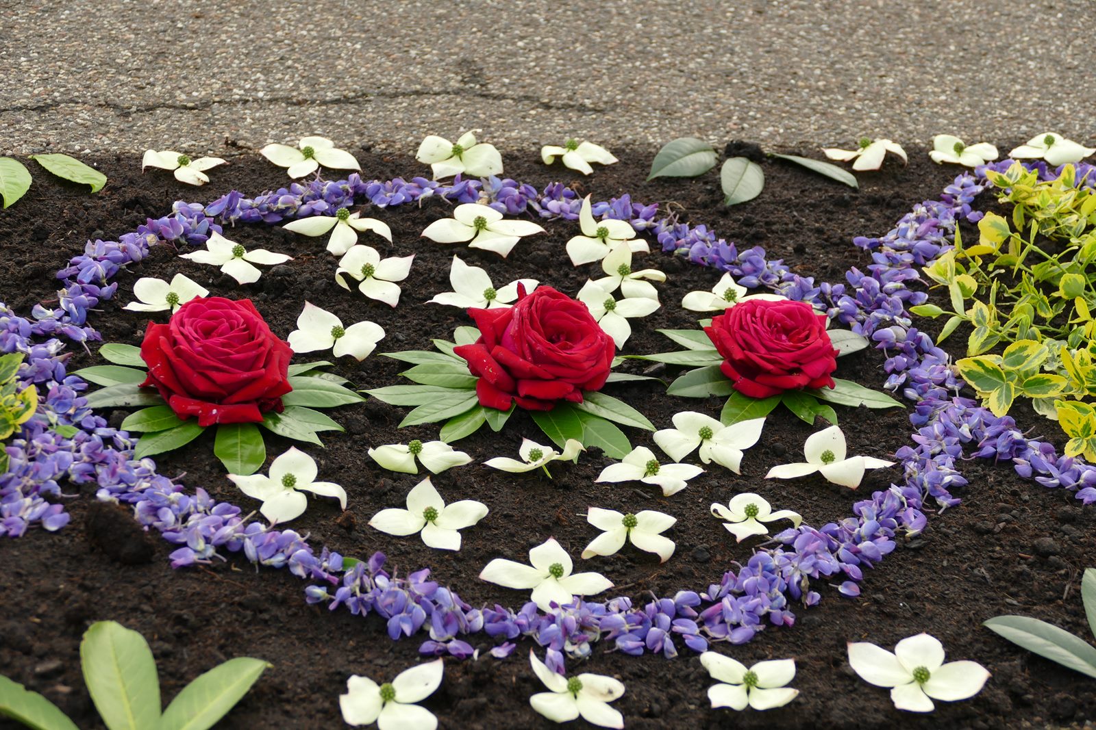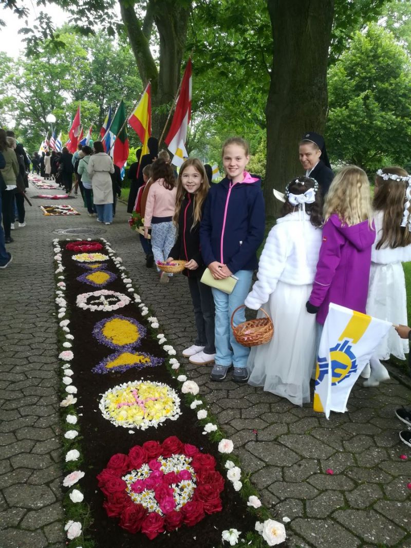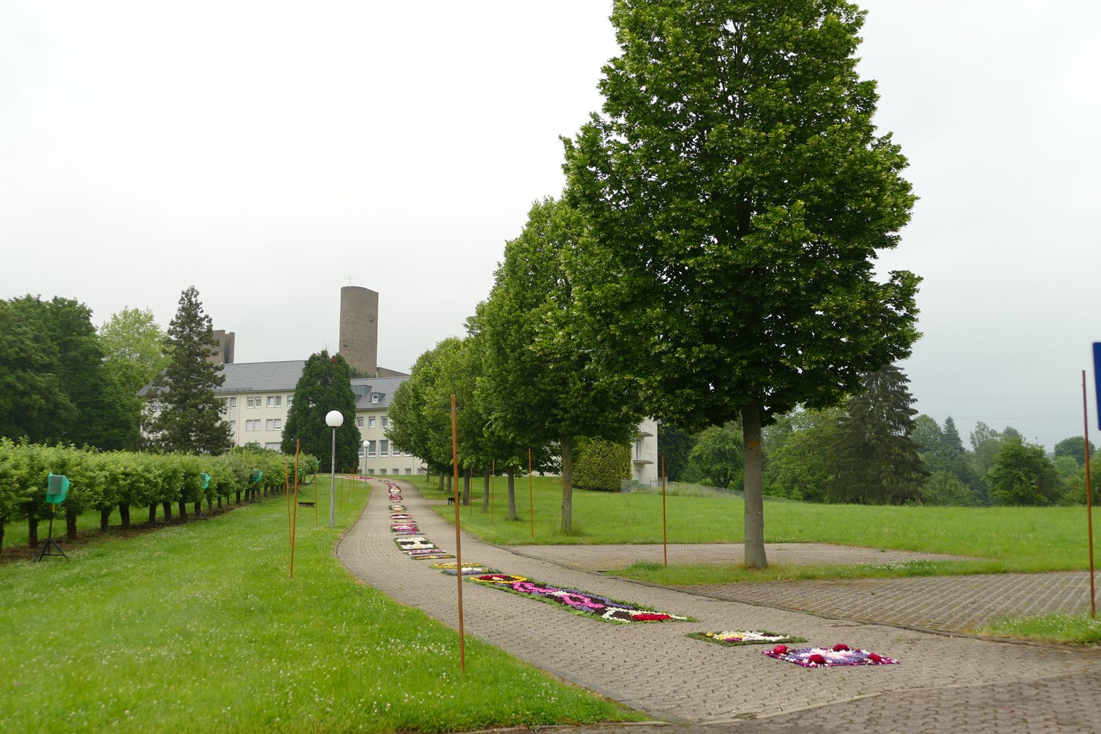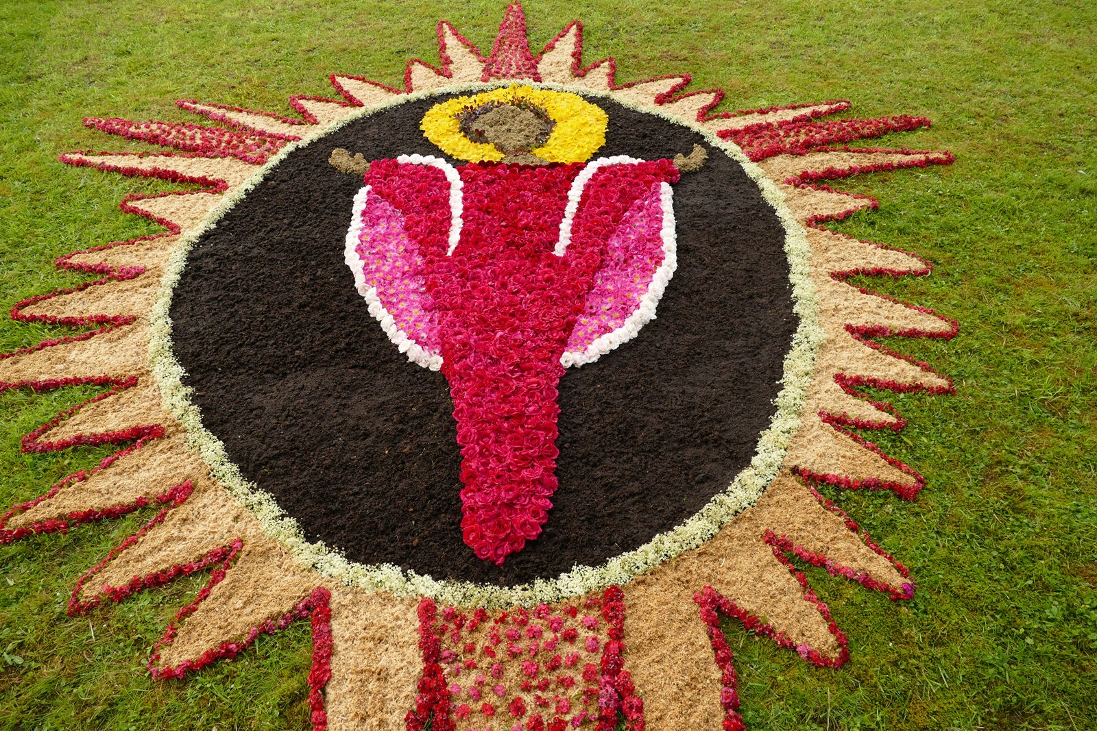 Auf allen Wegen sah man Blumenarrangements. Große Blumenteppiche schmückten das Gelände vor den vier Altären der Prozession. Mit viel Liebe zum Detail und großer Kreativität entstanden zahlreiche Kunstwerke.