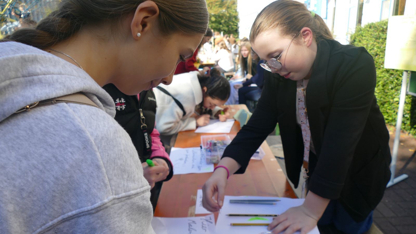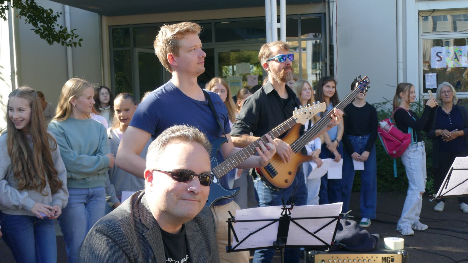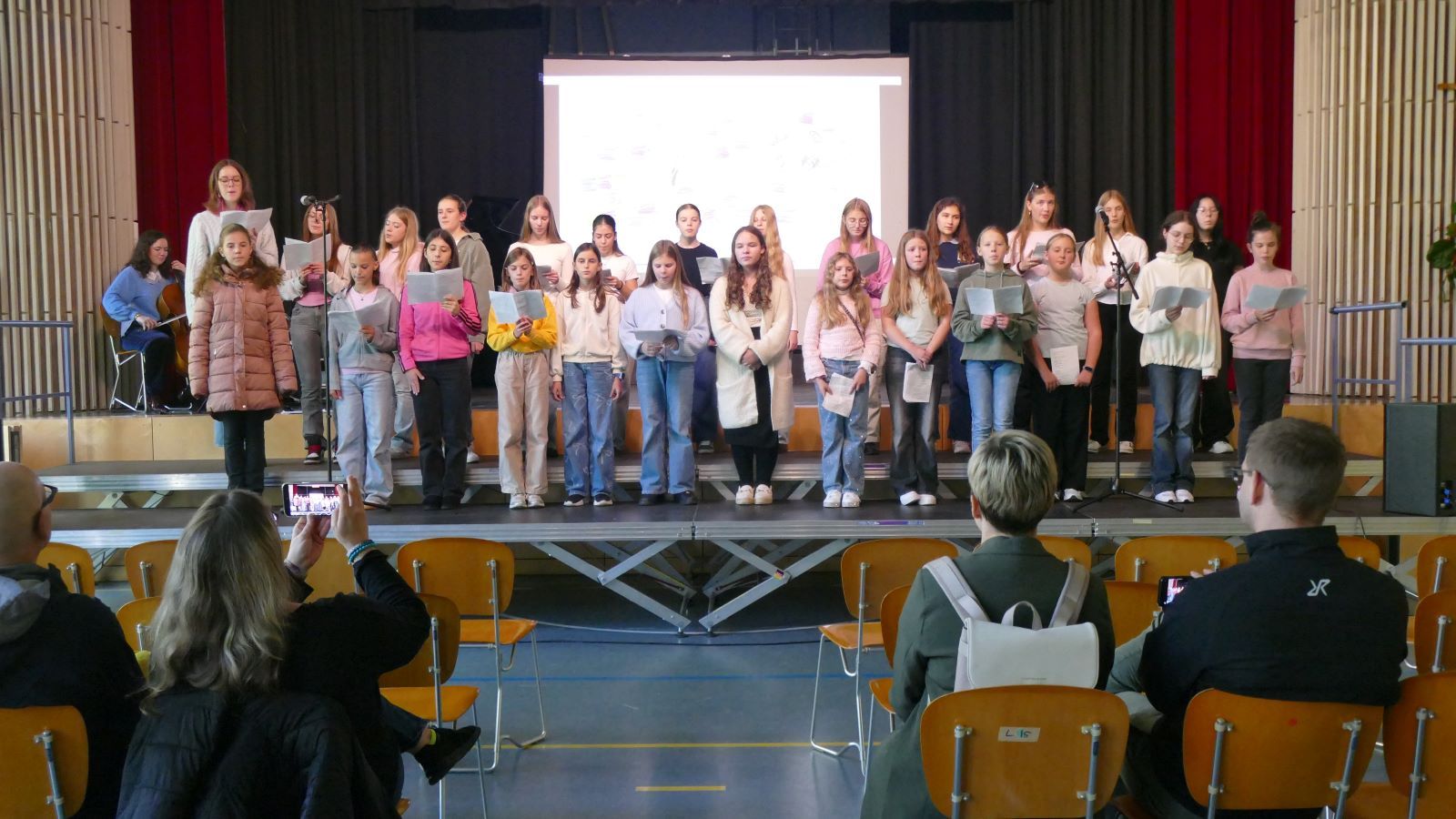 Die Schulleitung dankte im Anschluss der scheidenden Schülersprecherinnen, die zusammen mit der neuen SV auf die Bühne gekommen waren, und wünschte den neu gewählten Schülersprecherinnen alles Gute. Auch zwei der neuen Lehrerinnen präsentierten sich der Schulgemeinschaft. Besonders bedankt wurde Maya M. aus der MSS 11, die das Bild zum Schuljubiläum gestaltet hatte.