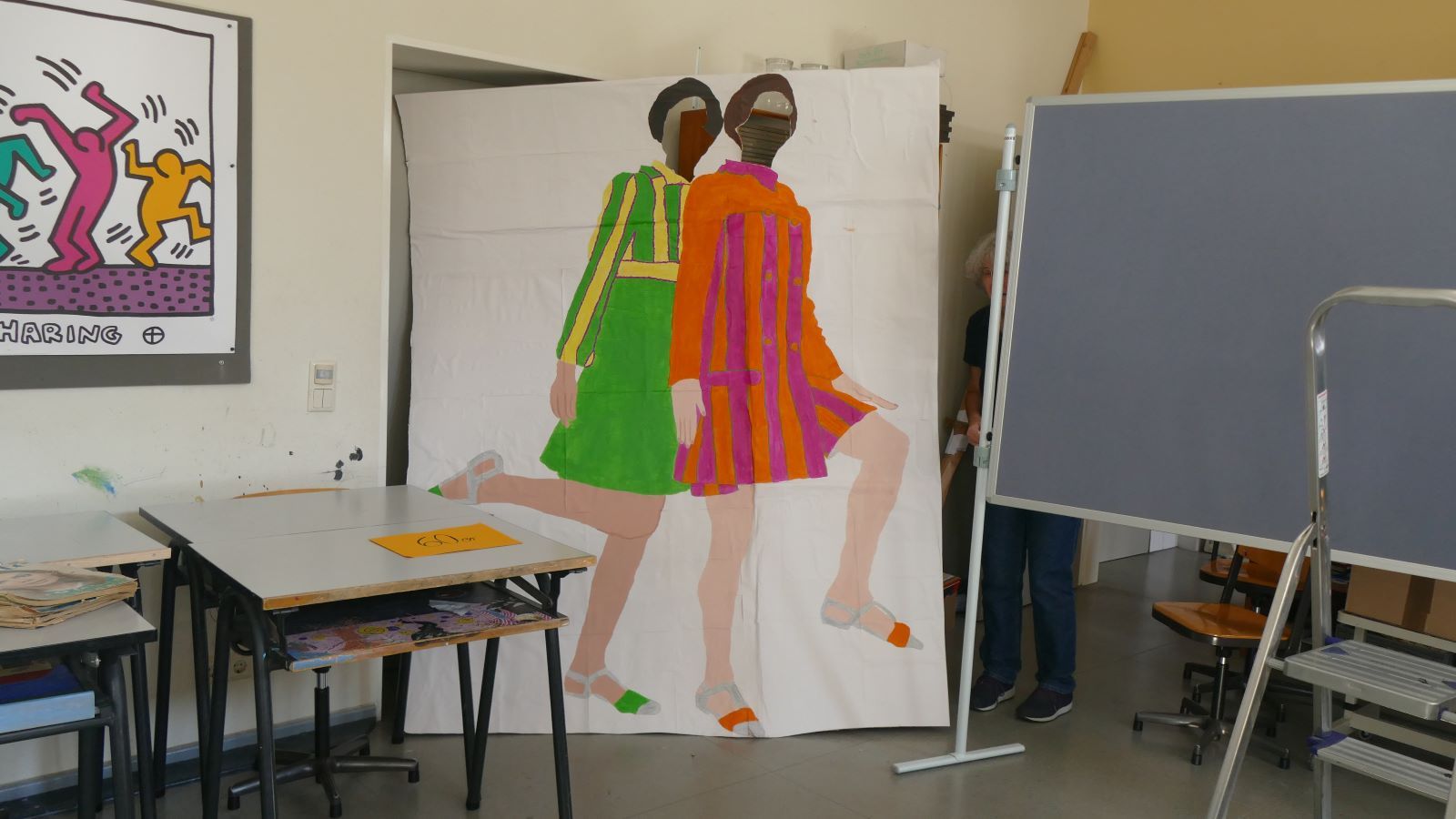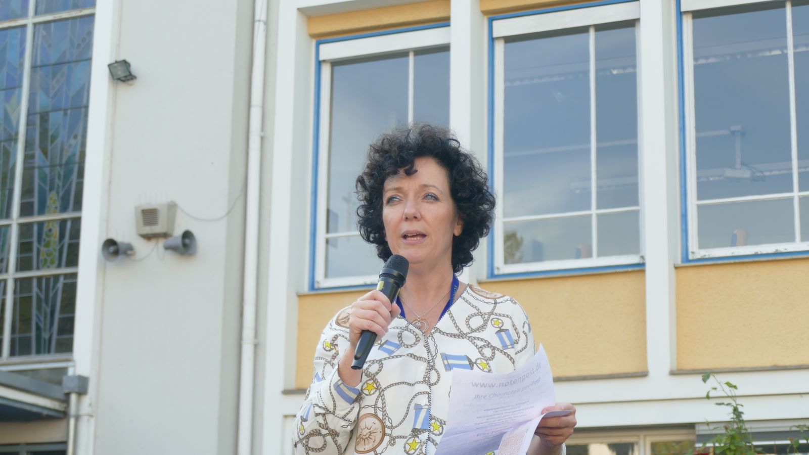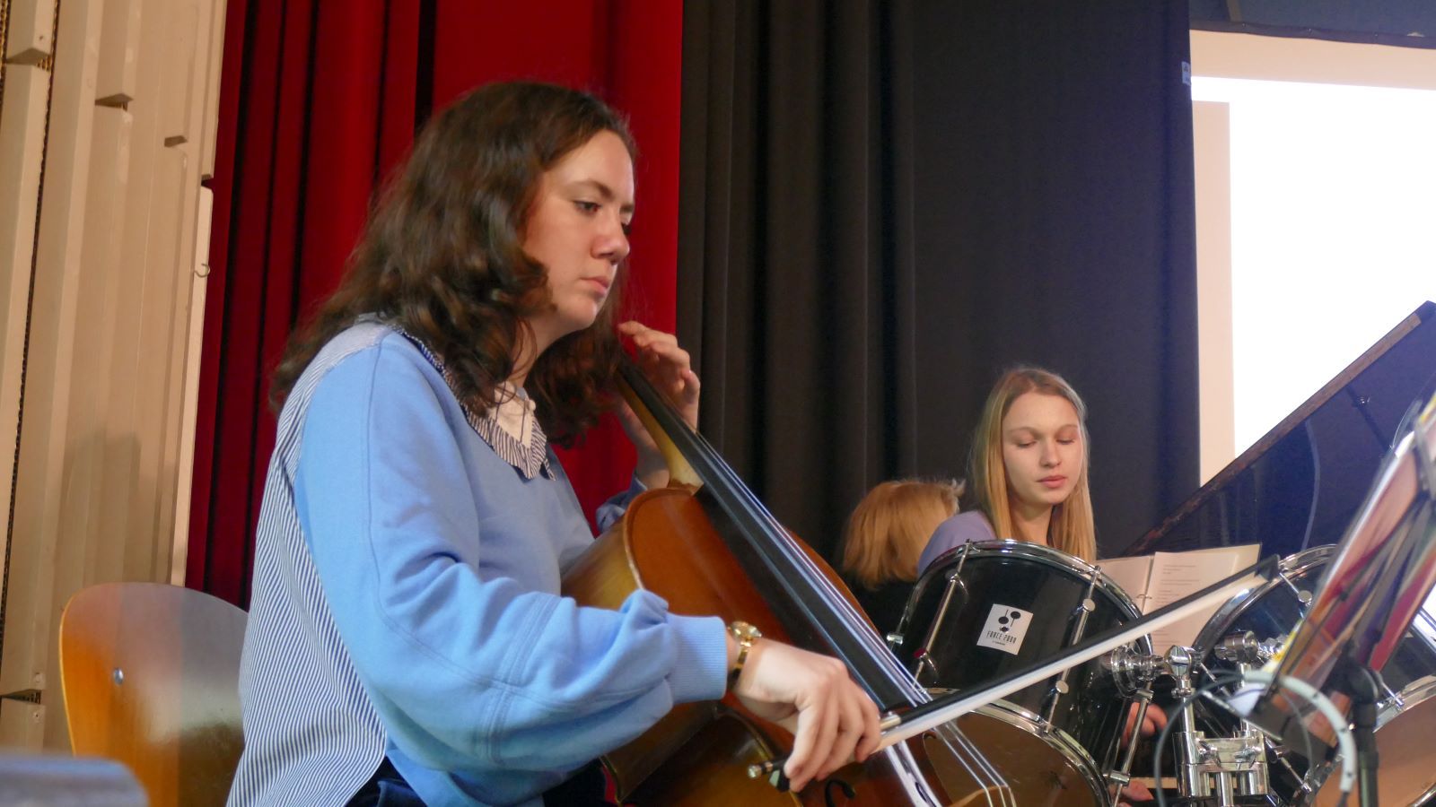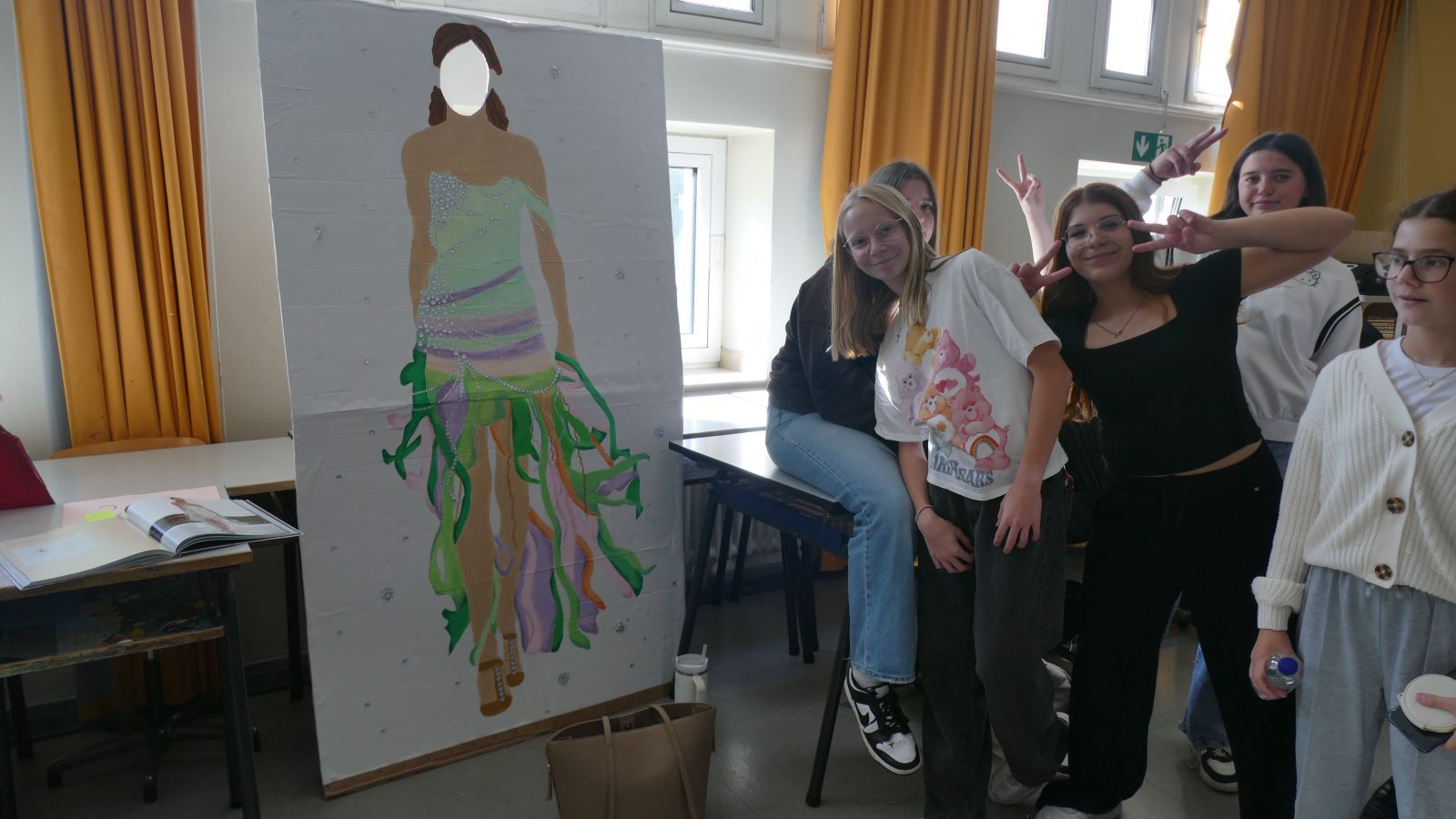 Die Schulleitung dankte im Anschluss der scheidenden Schülersprecherinnen, die zusammen mit der neuen SV auf die Bühne gekommen waren, und wünschte den neu gewählten Schülersprecherinnen alles Gute. Auch zwei der neuen Lehrerinnen präsentierten sich der Schulgemeinschaft. Besonders bedankt wurde Maya M. aus der MSS 11, die das Bild zum Schuljubiläum gestaltet hatte.