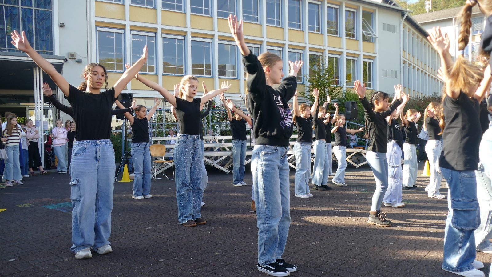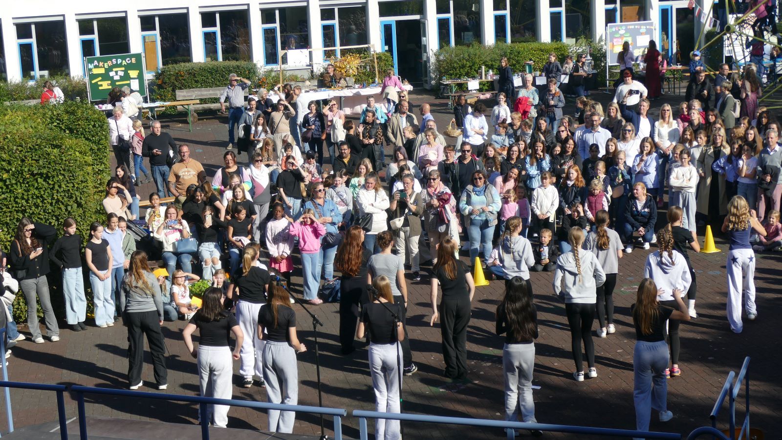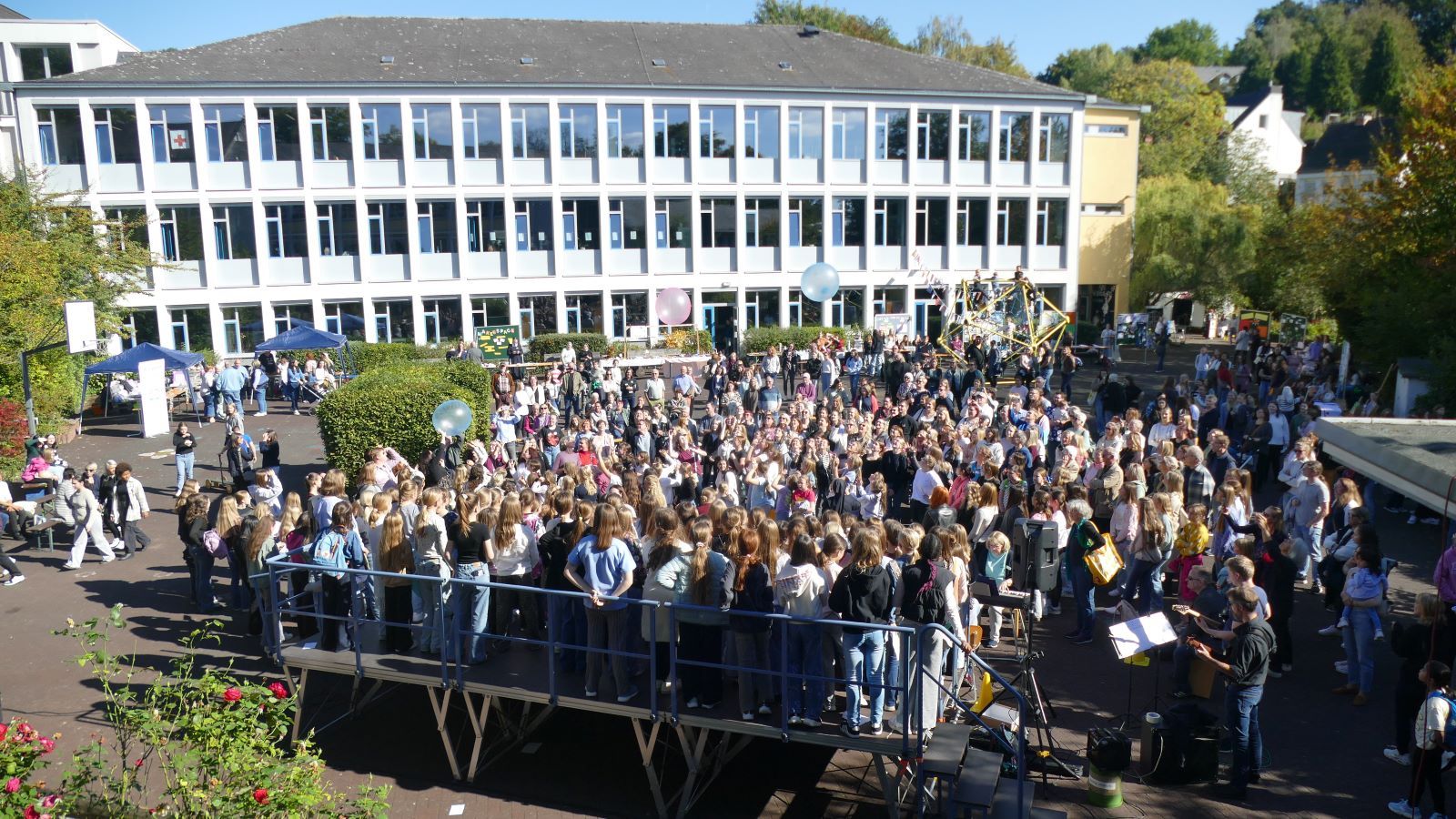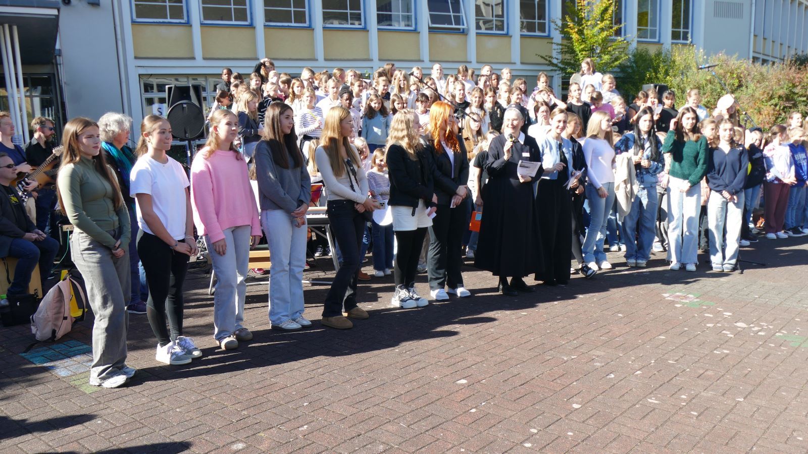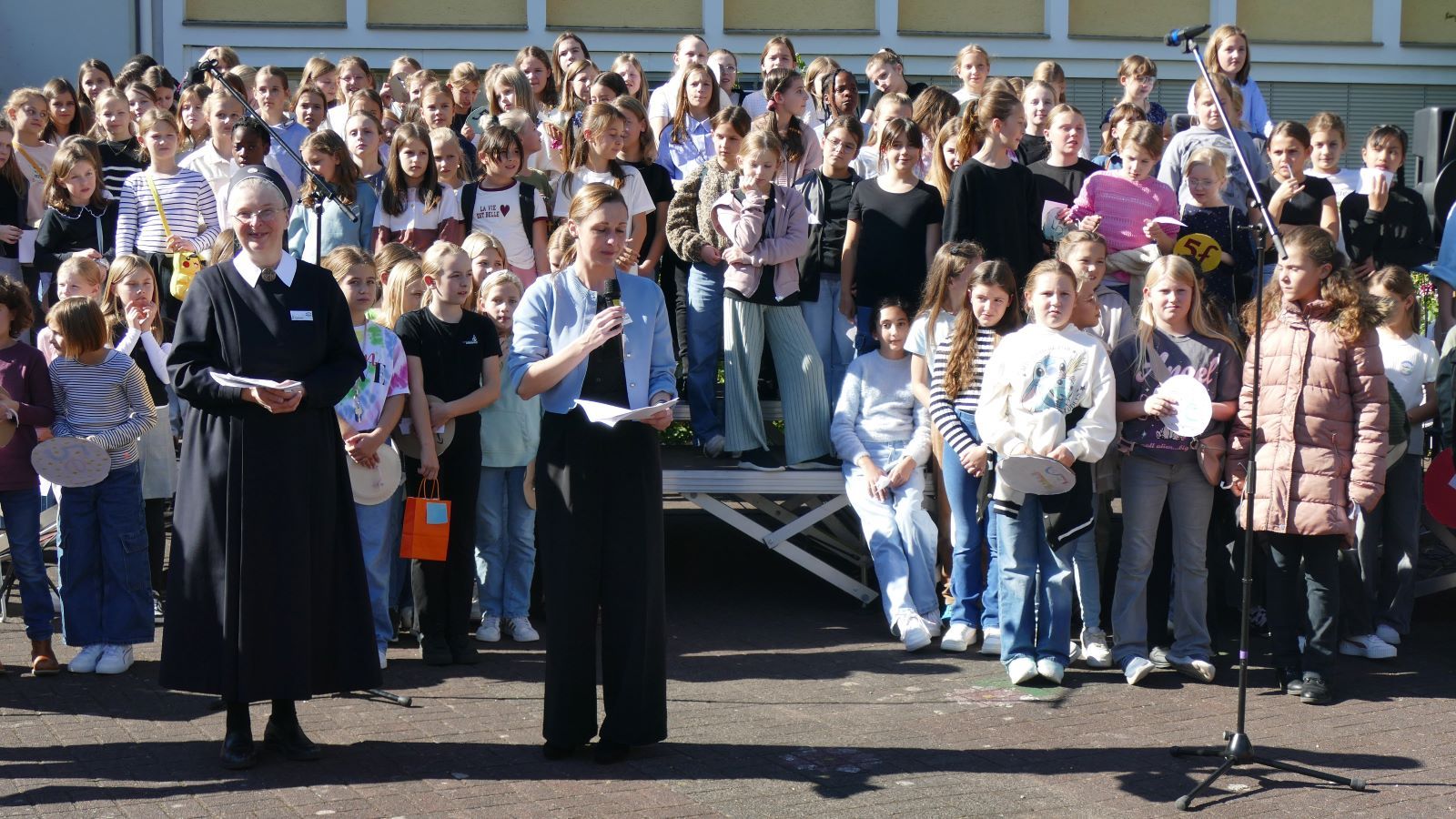 Was in den 46 Projekten gestaltet und erarbeitet, geprobt und kreiert worden ist, das zeigten die Schülerinnen beim Schulfest am 01.10.2025, dem eigentlichen Jubiläumstag. Das Schulfest begann bei herrlichstem Wetter um 14 Uhr mit der Eröffnung auf dem unteren Schulhof. Sr. M. Gabriele und Frau Luß begrüßten die Schulgemeinschaft sowie die Gäste. Es stellten sich beim Eröffnungsprogramm die 130 Fünftklässlerinnen mit ihrem selbst gedichteten Klassenlied vor. Ein Geburtstagslied mit einem „Hoch auf uns, auf unsere Schule“ durfte nicht fehlen.