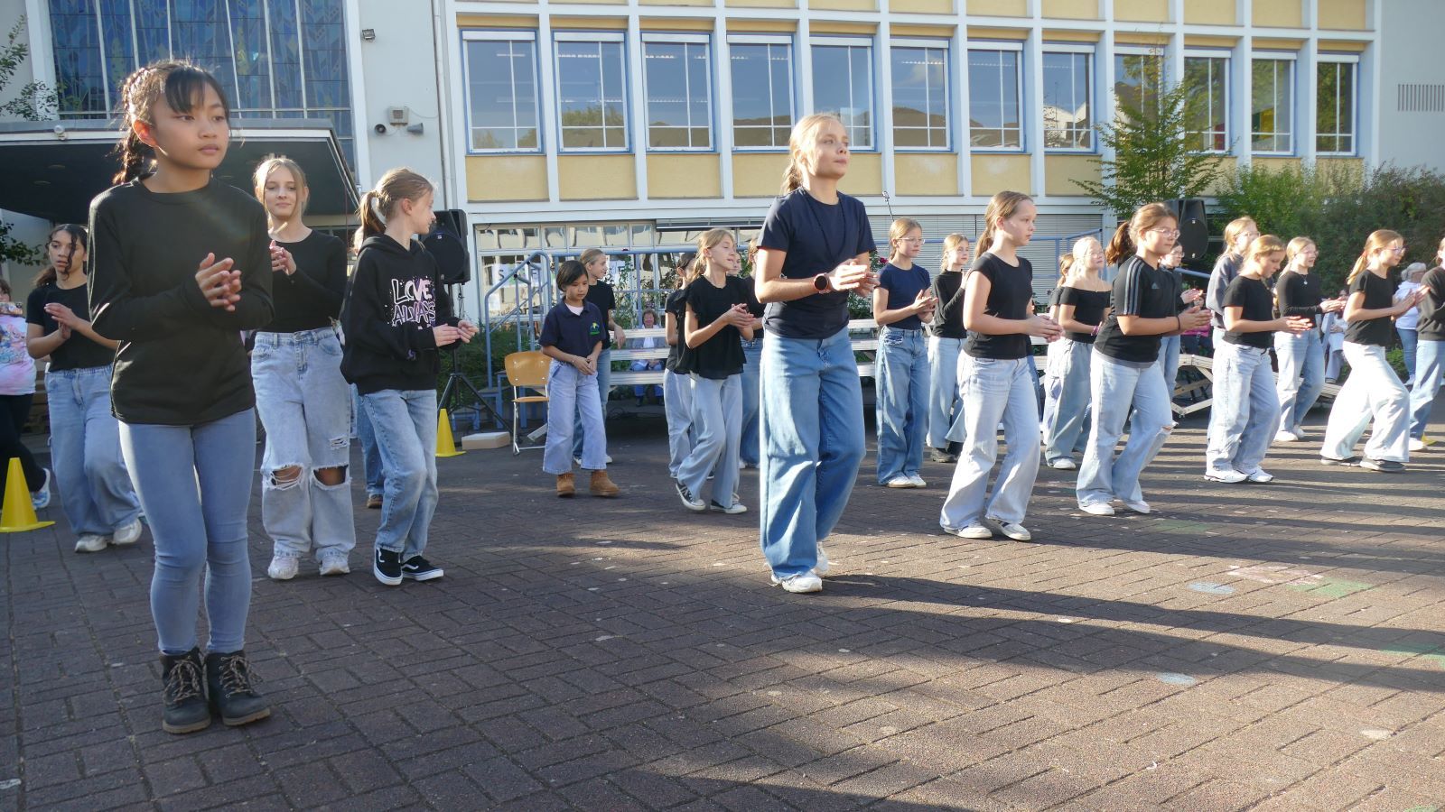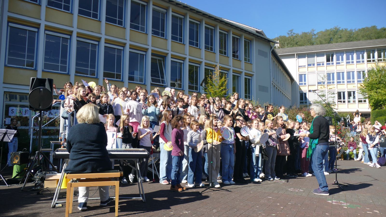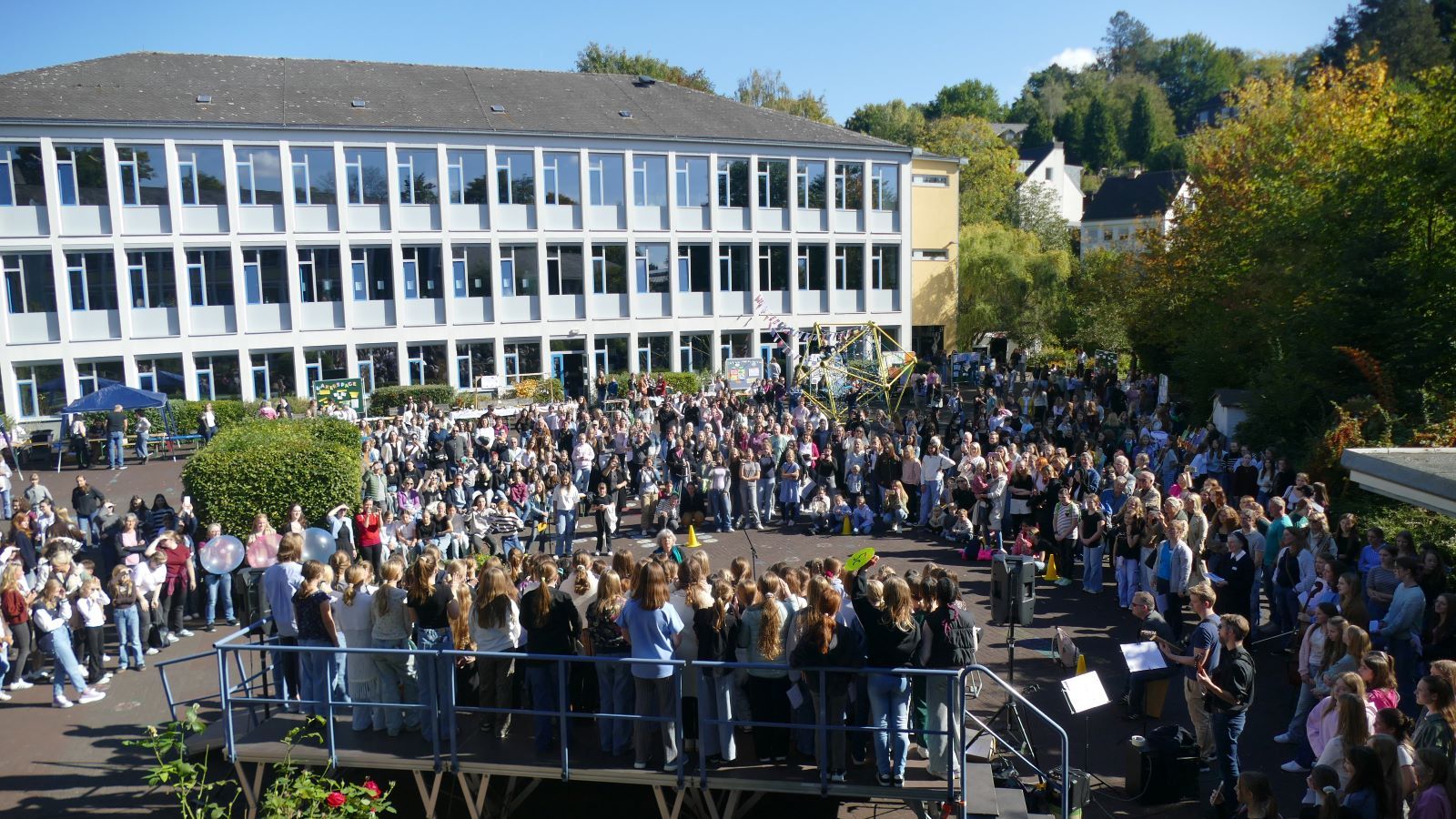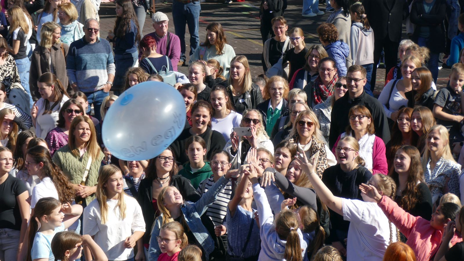 Was in den 46 Projekten gestaltet und erarbeitet, geprobt und kreiert worden ist, das zeigten die Schülerinnen beim Schulfest am 01.10.2025, dem eigentlichen Jubiläumstag. Das Schulfest begann bei herrlichstem Wetter um 14 Uhr mit der Eröffnung auf dem unteren Schulhof. Sr. M. Gabriele und Frau Luß begrüßten die Schulgemeinschaft sowie die Gäste. Es stellten sich beim Eröffnungsprogramm die 130 Fünftklässlerinnen mit ihrem selbst gedichteten Klassenlied vor. Ein Geburtstagslied mit einem „Hoch auf uns, auf unsere Schule“ durfte nicht fehlen.