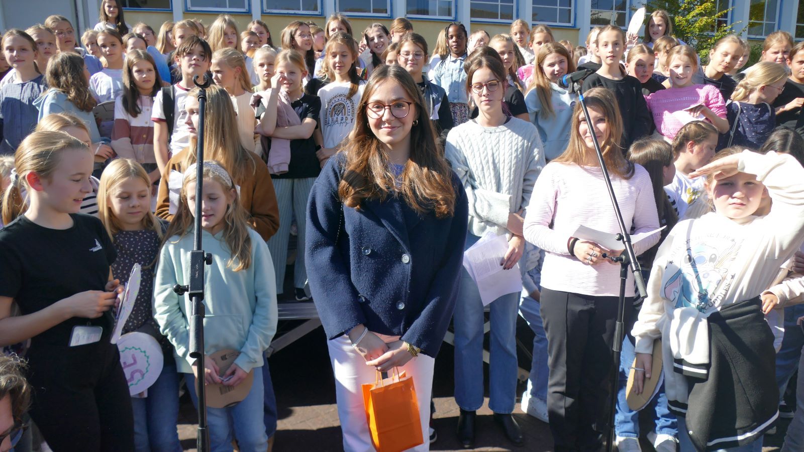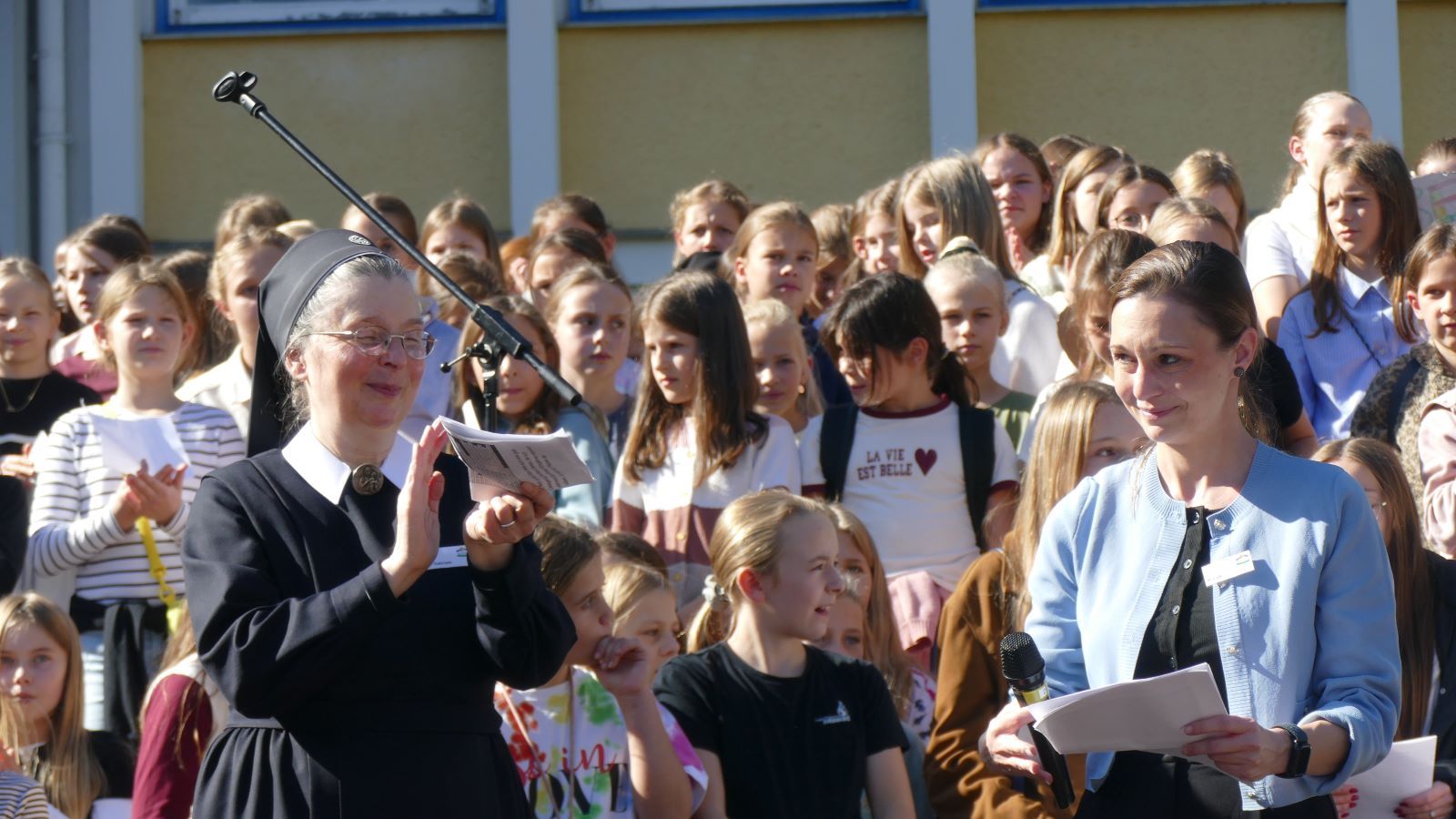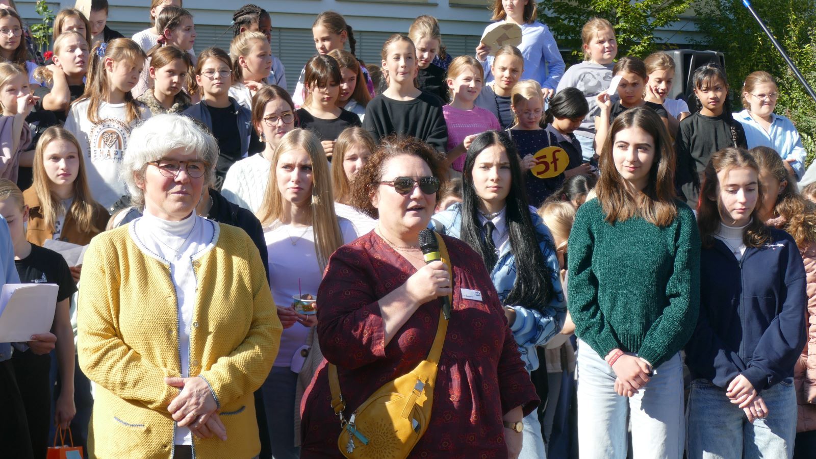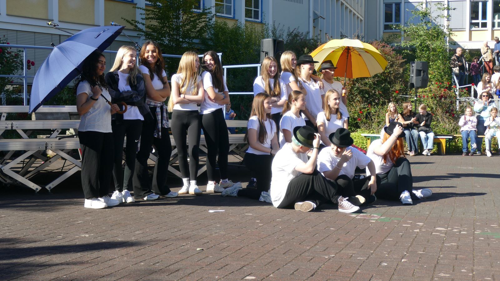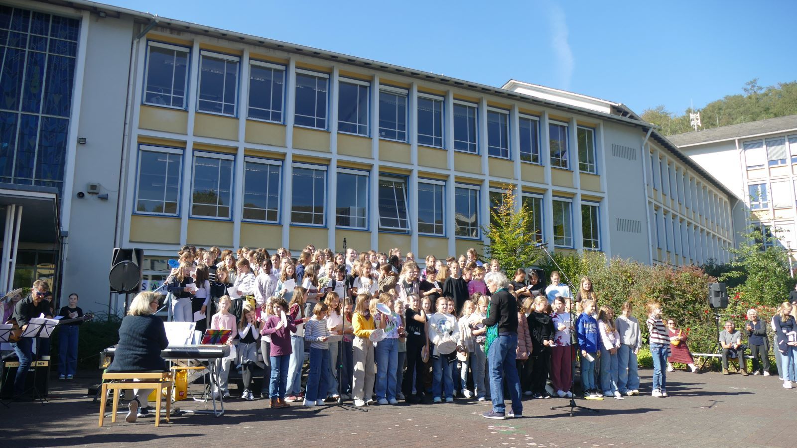 Was in den 46 Projekten gestaltet und erarbeitet, geprobt und kreiert worden ist, das zeigten die Schülerinnen beim Schulfest am 01.10.2025, dem eigentlichen Jubiläumstag. Das Schulfest begann bei herrlichstem Wetter um 14 Uhr mit der Eröffnung auf dem unteren Schulhof. Sr. M. Gabriele und Frau Luß begrüßten die Schulgemeinschaft sowie die Gäste. Es stellten sich beim Eröffnungsprogramm die 130 Fünftklässlerinnen mit ihrem selbst gedichteten Klassenlied vor. Ein Geburtstagslied mit einem „Hoch auf uns, auf unsere Schule“ durfte nicht fehlen.