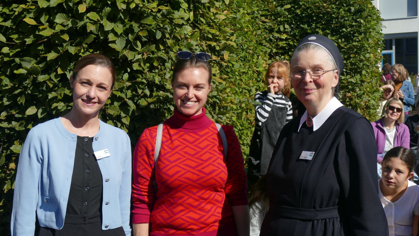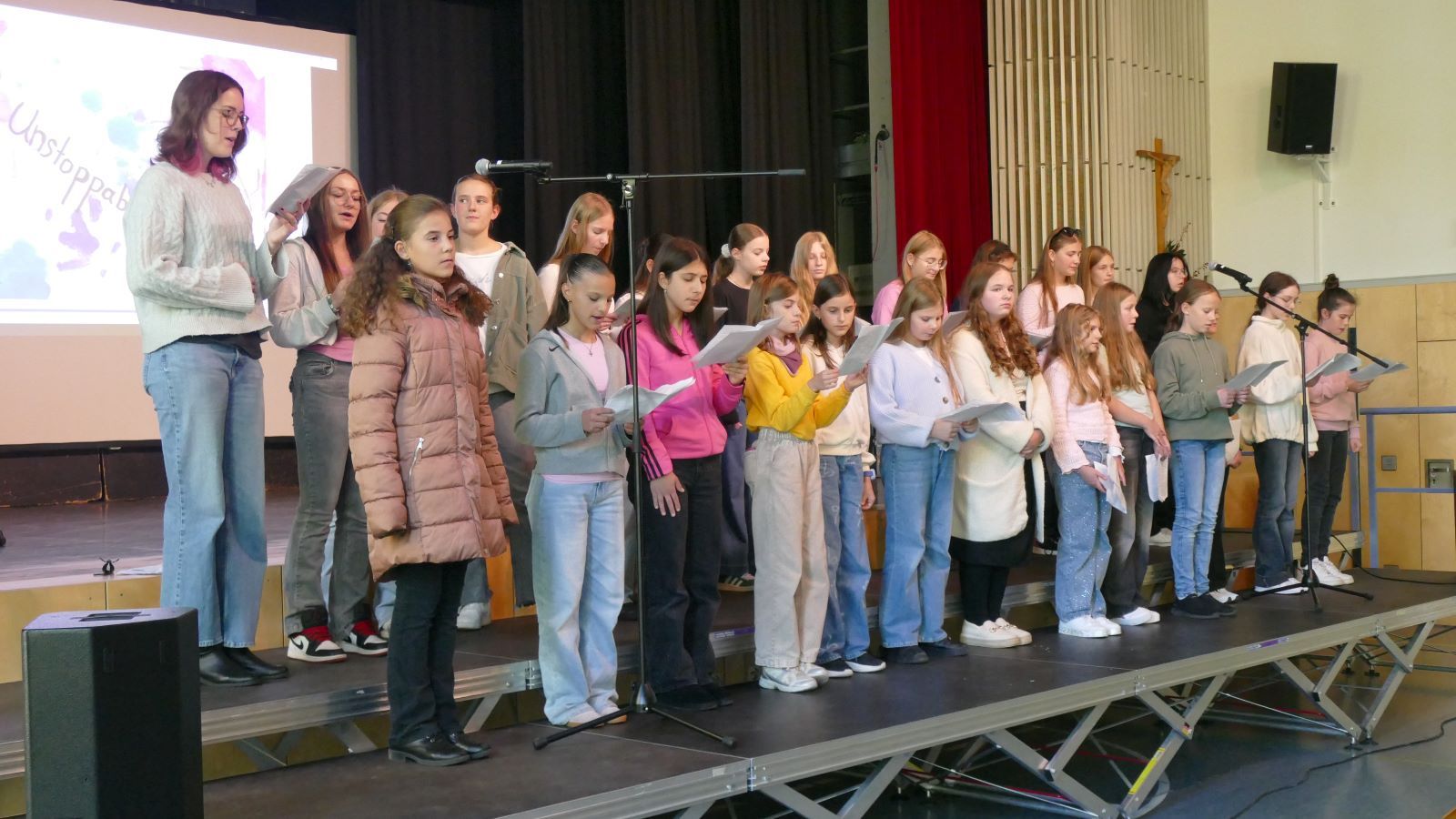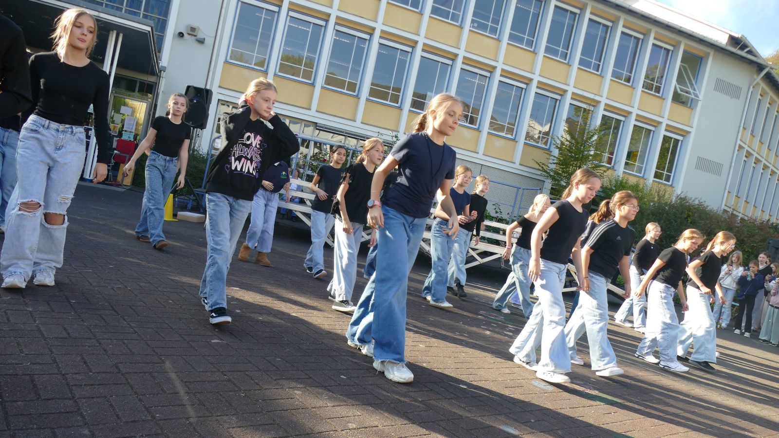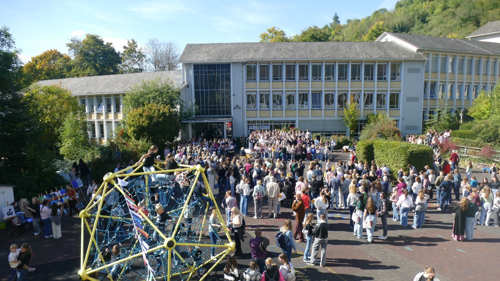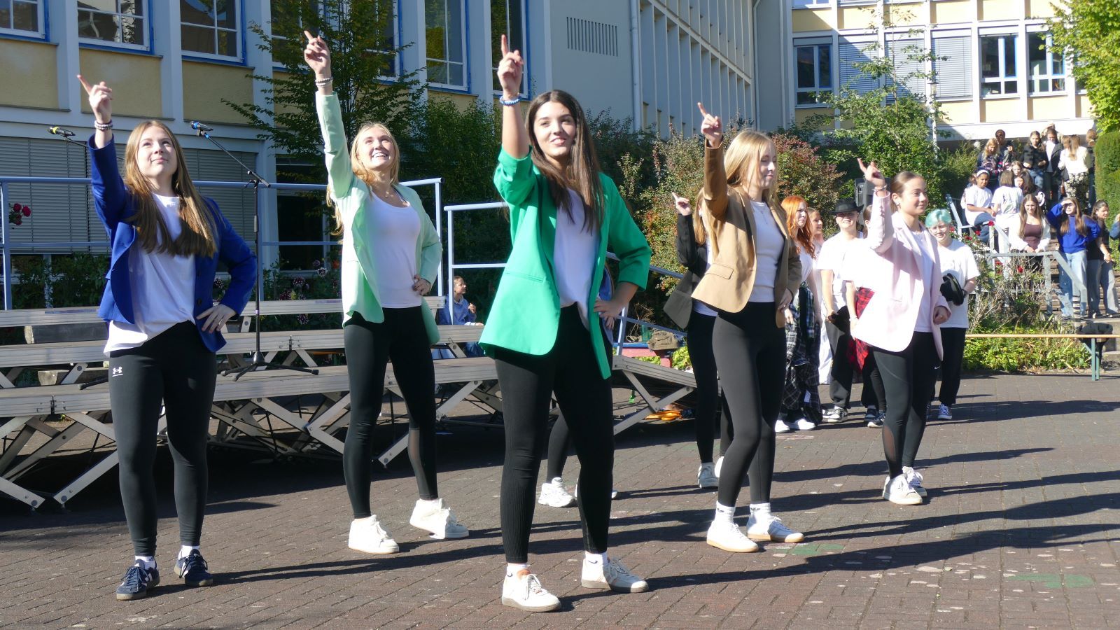 Was in den 46 Projekten gestaltet und erarbeitet, geprobt und kreiert worden ist, das zeigten die Schülerinnen beim Schulfest am 01.10.2025, dem eigentlichen Jubiläumstag. Das Schulfest begann bei herrlichstem Wetter um 14 Uhr mit der Eröffnung auf dem unteren Schulhof. Sr. M. Gabriele und Frau Luß begrüßten die Schulgemeinschaft sowie die Gäste. Es stellten sich beim Eröffnungsprogramm die 130 Fünftklässlerinnen mit ihrem selbst gedichteten Klassenlied vor. Ein Geburtstagslied mit einem „Hoch auf uns, auf unsere Schule“ durfte nicht fehlen.