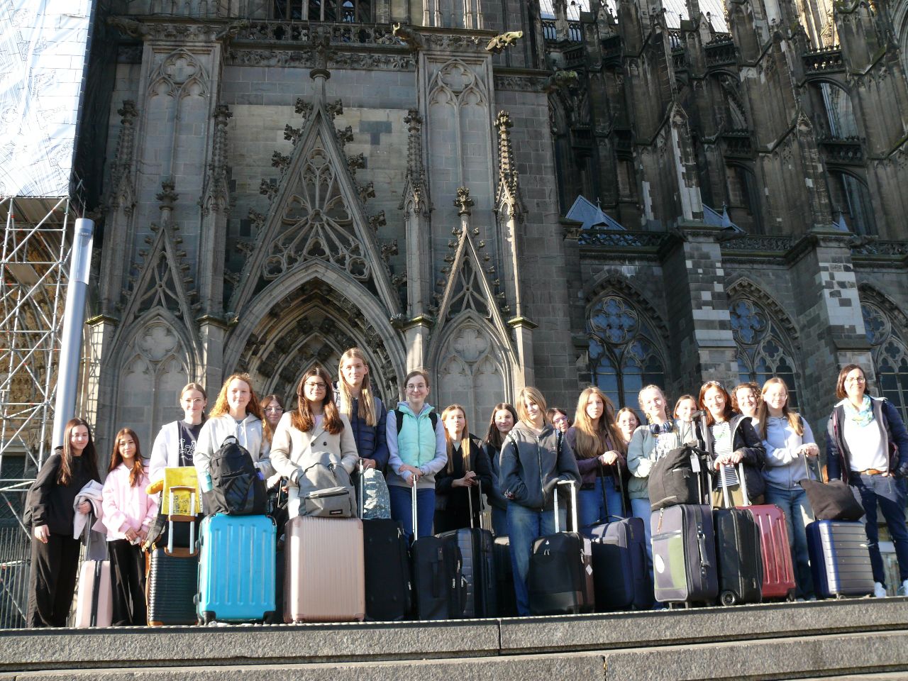 Um 5.45 traf sich die Reisegruppe vor der Marienschule. Das erste Gruppenfoto wurde vor dem Kölner Dom gemacht. In Köln stiegen alle den Thalys „Eurostar“ Richtung Paris Nord ein. In Frankreichs Hauptstadt angekommen nahmen sie die Metro und fuhren 14 Stationen quer durch Paris bis zum Bahnhof Montparnasse. Auch hier, mit Blick auf die „Tour Montparnasse“, wurde ein Gruppenbild aufgenommen. Mit dem TGV fuhren die Schülerinnen weiter bis nach Saint-Malo. Die letzte Etappe bis nach Plouër sur Rance legten sie im Bus zurück. Dort warteten die französischen Austauschschülerinnen und Schüler des Collège Saint Stanislas nach Schulschluss um 16.45 bereits. Dieser Moment der ersten Begegnung ist immer spannend und aufregend, ebenso wie der erste Abend in den Gastfamilien.
