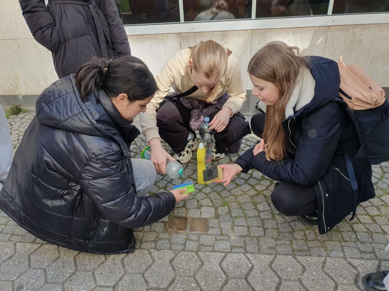 Am Ende unserer Exkursion bewegten wir uns in Richtung Heerstraße und Hellenstraße und säuberten dort Stolpersteine. Auch über die Geschichte dieser Steine lernten wir viel. Sie erinnern an jüdische Bürger, die aus ihren Wohnungen bzw. Häusern vertrieben und von denen die meisten von den Nationalsozialisten getötet wurden.