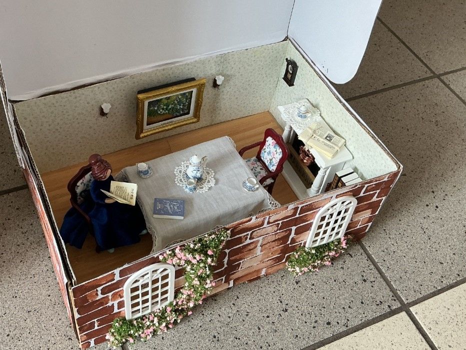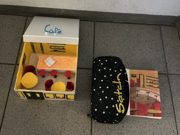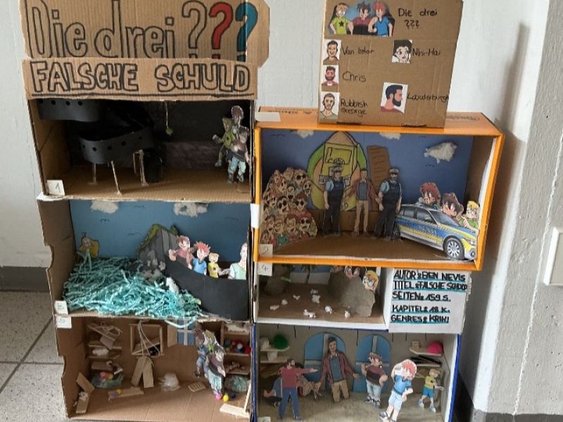 Im Deutschunterricht wählten die Schülerinnen der jetzigen 8c ein Buch, das sie lesen und mit dem sie sich im Anschluss näher beschäftigen wollten. Dabei wurden Vorträge, Plakate, Leserollen, aber auch Schuhkartons kreativ gestaltet. Hier sind drei ganz besondere Exemplare zu den Büchern „Die drei ??? - Falsche Schuld“, „Stolz und Vorurteil“ und „Das Café am Rande der Welt“ zu sehen.