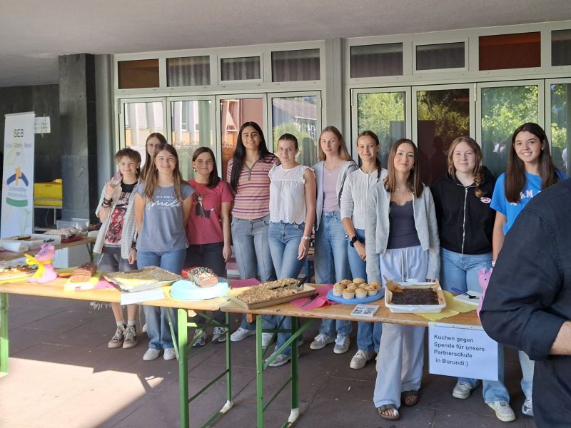 Die Klassen 10c und 10d haben fleißig Kuchen gebacken. Weitere Kuchen wurden vom SEB beigesteuert. Am Dienstag, 19.08.25, dem Einschulungstag der neuen 5er, konnten die Eltern in der Pause gegen eine Spende reichlich Kuchen essen. Fast 480 € (!) an Spenden kamen so für unsere Partnerschule in Burundi zusammen. Nachdem wir im Sommer mit Unterstützung von "Lehrerinnen und Lehrern ohne Grenzen e.V." die Schlafsäle unsere Partnerschule in Burundi renovieren konnten, steht nun das nächste Projekt an. Der Speisesaal hat ein undichtes Dach und der Betonboden besitzt Löcher. Ebenso sind einige Klassenräume dringend renovierungsbedürftig. Wir freuen uns, dass so viele Naschkatzen gespendet haben. Es blieb kein Stück Kuchen übrig. Diese Spende ist ein guter Startschuss für unser nächstes Projekt!