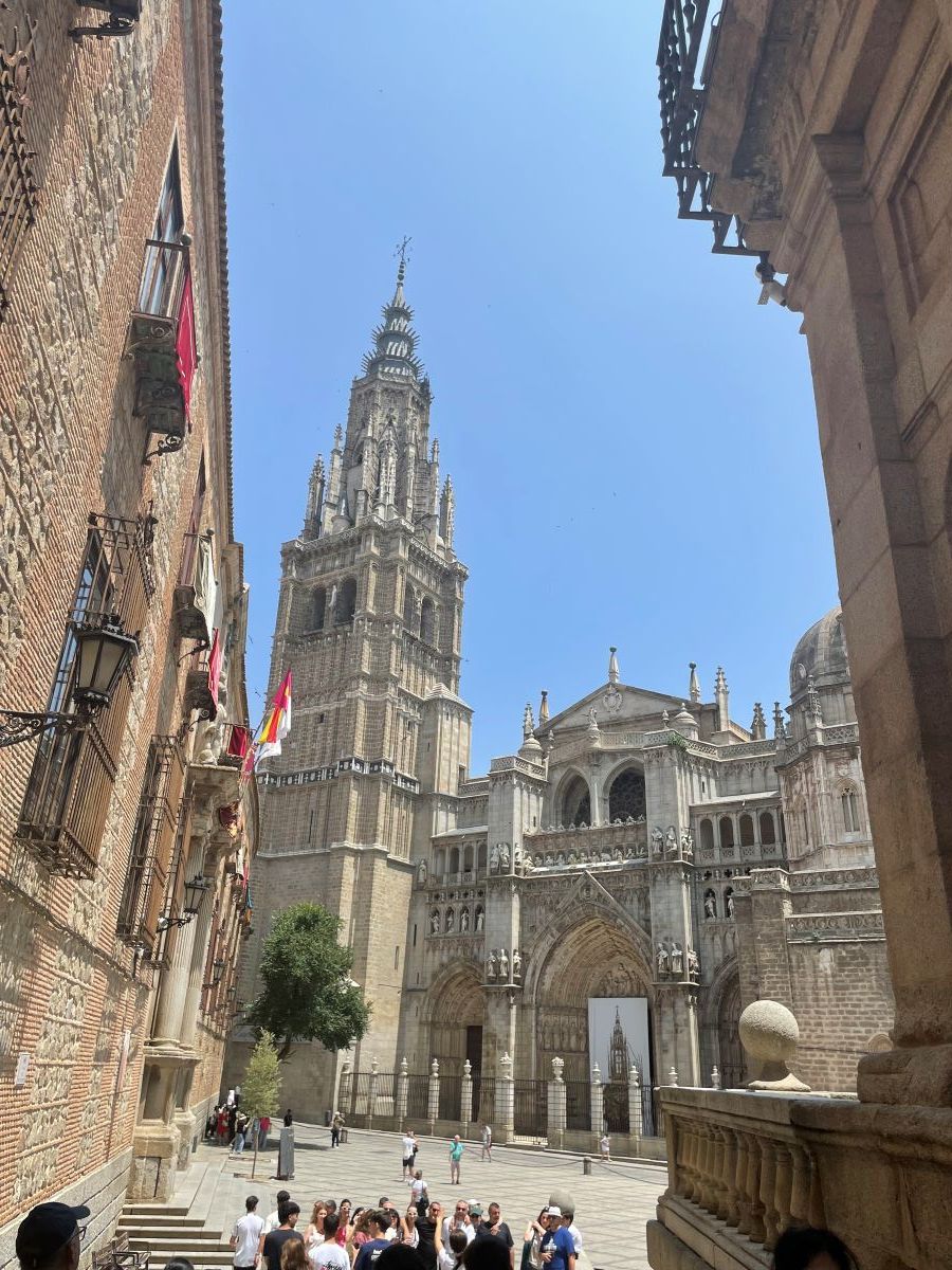 Am Donnerstag, den 12.06., sind wir, die deutschen Schülerinnen, morgens in die Stadt Toledo gefahren. Dort liefen gerade die Vorbereitungen für Fronleichnam, sodass wir die verschiedenen Dekorationen bewundern konnten. Am Vormittag besuchten wir die Kathedrale, in der es sowohl Kunstwerke als auch goldgeschmückte Fassaden zu sehen gab.