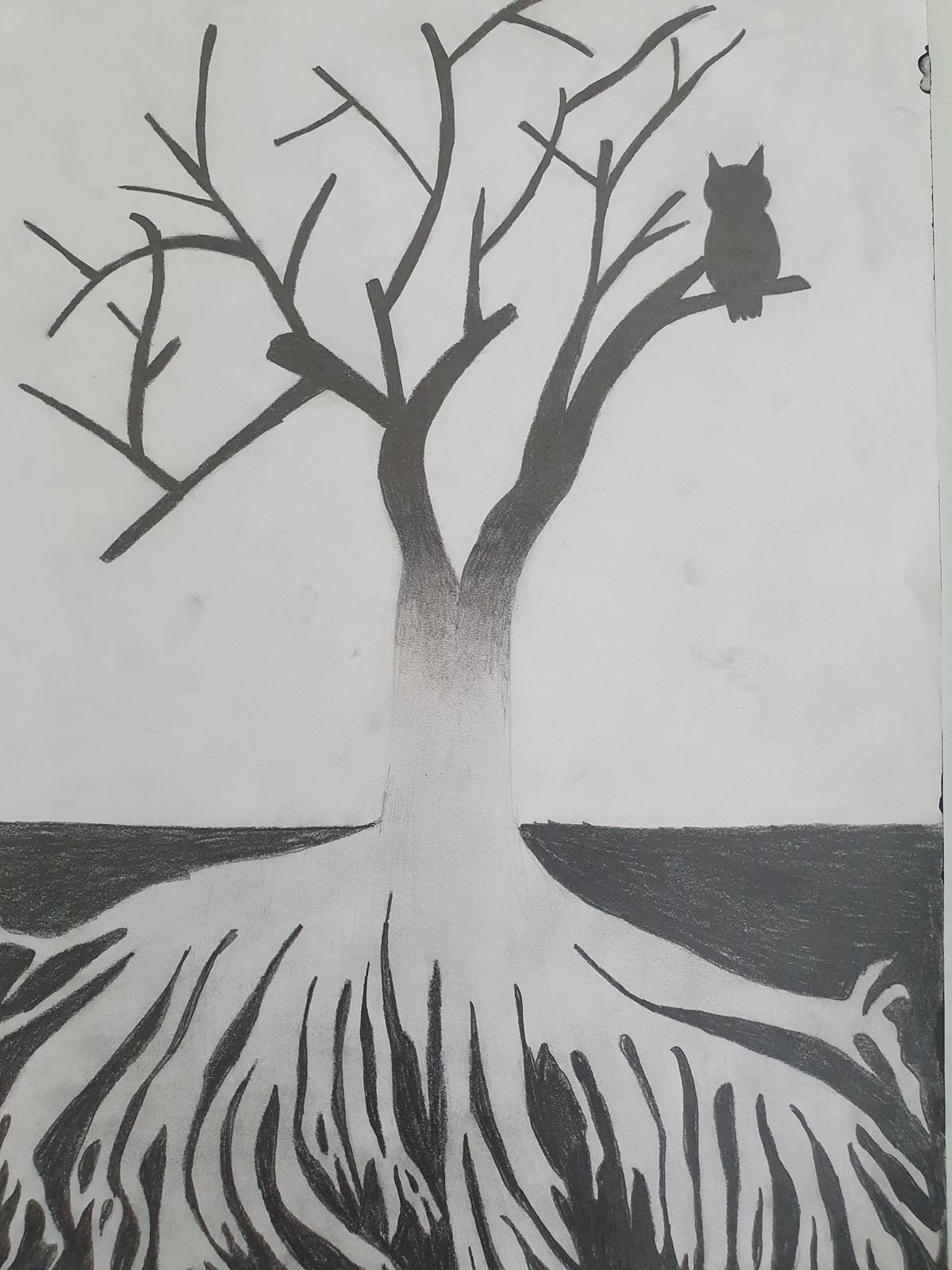 In dieser graphischen Übung wurde nach der Spielregel, von Dunkel nach Hell zu gestalten, ein Baum mit seiner Krone und dem entsprechenden, Halt gebenden Wurzelwerk dargestellt. Die Ergebnisse zeugen davon, dass die Schülerinnen diese Übung, die Fingerspitzengefühl und Feinarbeit verlangt, mit Ausdauer und Konzentration gelöst haben.