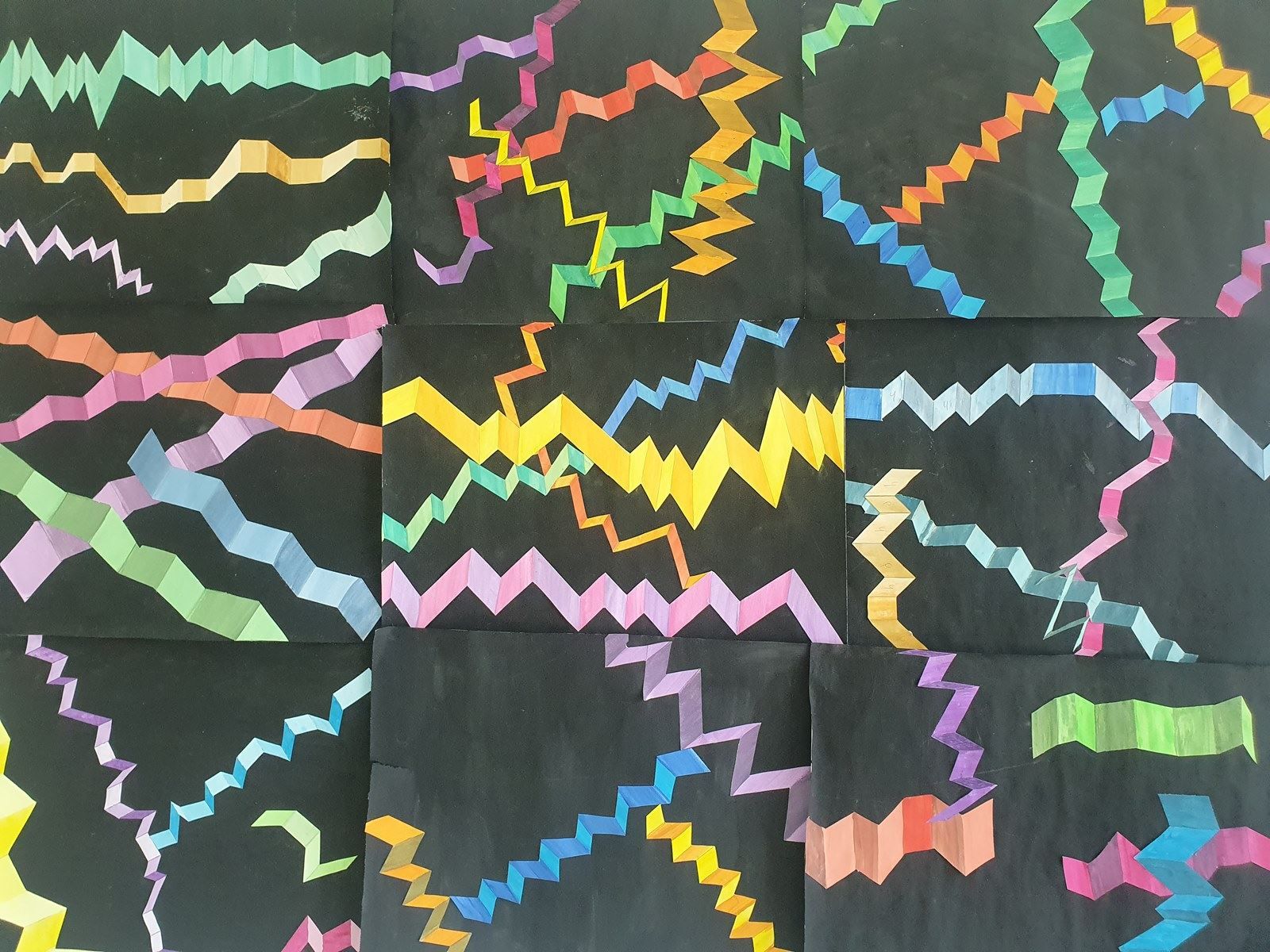 Die Übung Farbbänder führt zur Parallelperspektive hin. Mit der Wirkung von Überschneidungen und der Licht – und Schattenwirkung wurde geübt, räumlich wirkende Ergebnisse zu erzielen. Das Zusammenfassen der Ergebnisse zu Gruppenbildern hat die Übung am Ende mit überzeugenden Ergebnissen abgerundet.