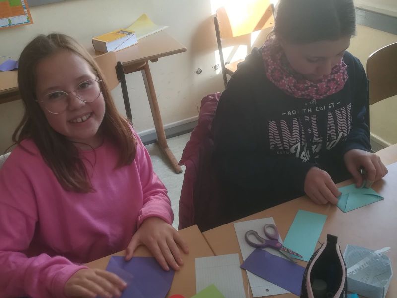 Schülerinnen einer 6. Klasse nutzten die Verfügungsstunde am 26.09.2025, um Schächtelchen zu basteln. Die Bastelidee brachte eine GTS-Schülerin, die in der Ganztagsschule die Origami-AG besucht hatte, ein.