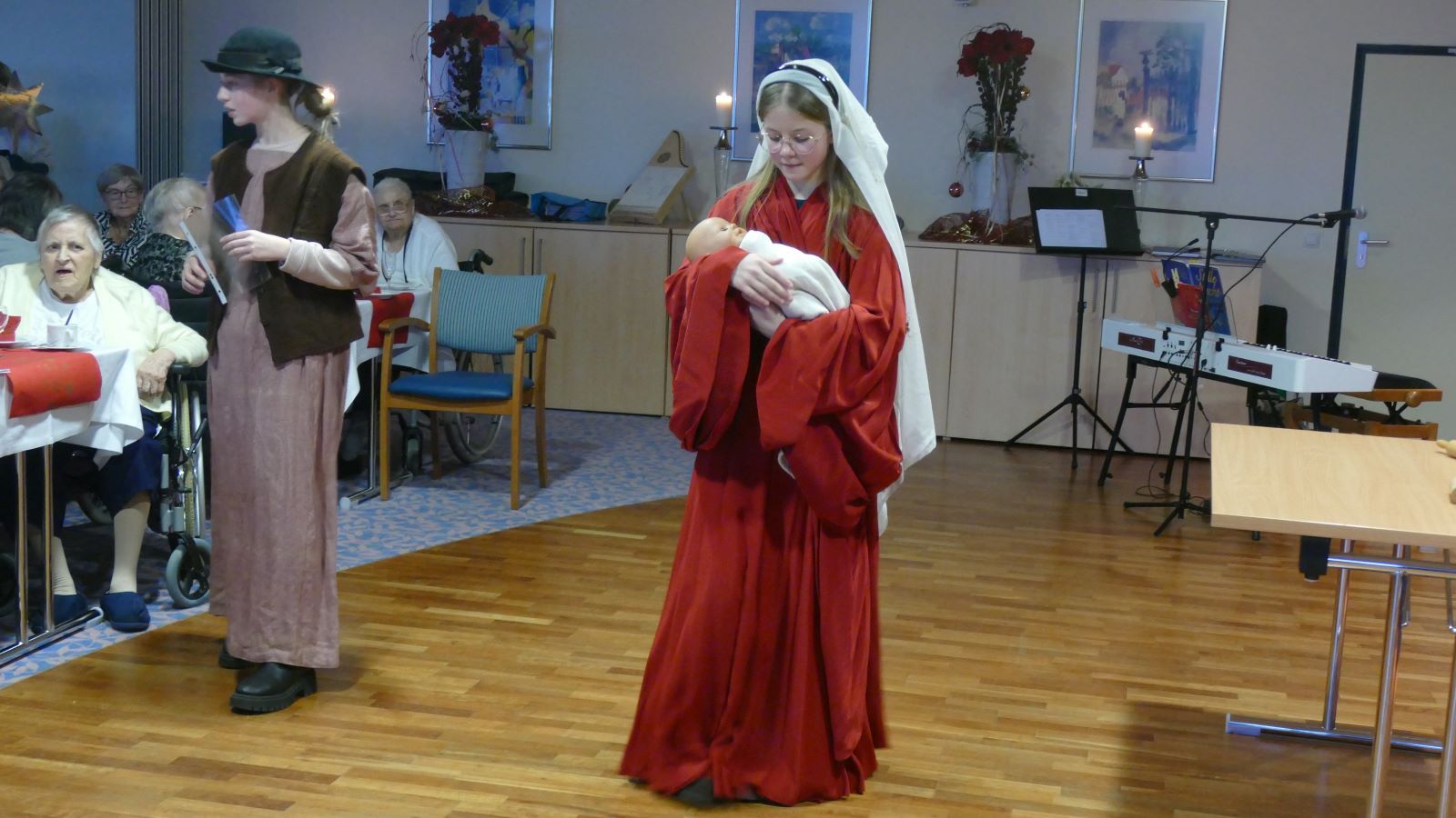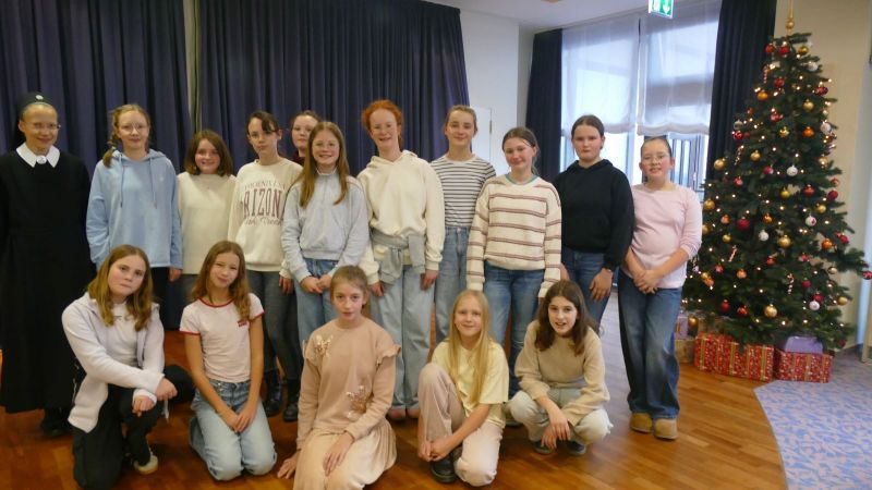 Seit einigen Jahren bringen Schülerinnen aus der Unterstufe der Marienschule einen Beitrag bei der Weihnachtsfeier in der Seniorenresidenz Humboldthöhe. Auch in diesem Jahr wurden wie wieder angefragt. Ene Gruppe von 16 Schülerinnen aus der Klasse 6d studierte ein kleines Theaterstück ein und trat bei der Feier am 17.12.2025 im großen Saal der Humboldthöhe auf.