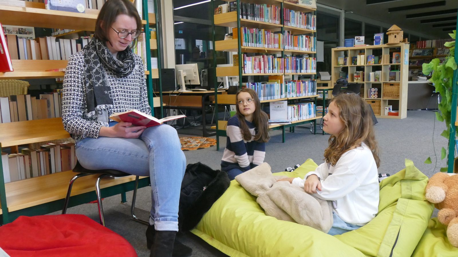 Ob auf dem roten Sofa, auf apfelgrünen Sitzkissen, dem Teppich oder auf Stühlen – überall machen es sich Schülerinnen der Unter- und Mittelstufe in der Leseecke der Bibliothek während der großen Pause gemütlichen und lauschen entspannt oder gespannt – je nachdem, welches Kapitel gerade dran ist – dem Roman „Lilli Holle und die Weihnachtsfamilie“. Verschiedene Deutschlehrerinnen geben ihr Bestes, die Romanhandlung zum Erlebnis werden zu lassen und auch über die große Pause hinaus die Freude am Lesen zu fördern. Viele der Zuhörerinnen sind selbst von Büchern begeistert; andere genießen es einfach, dass jemand ihnen vorliest.