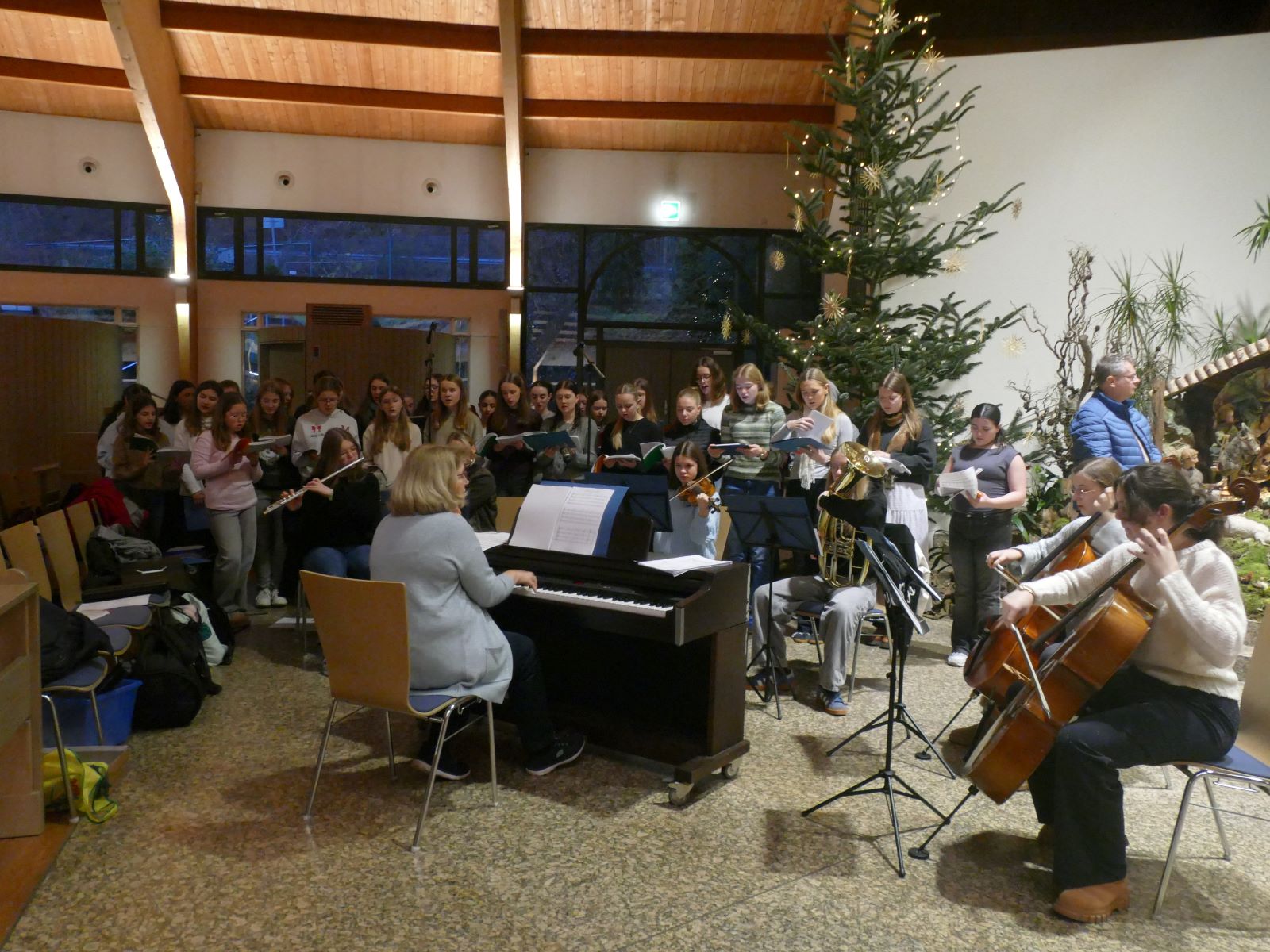 Wenn sich alle Schülerinnen der Klassen 5-13 mit ihren Lehrkräften zur ersten Stunde in Richtung Pilgerkirche bewegen, wenn die Kirche bereits in weihnachtlichem Festschmuck erstrahlt, sich der Schulchor einsingt und das Orchester-Ensemble die Instrumente stimmt, dann ist der letzte Schultag vor den ersehnten Weihnachtsferien gekommen.
