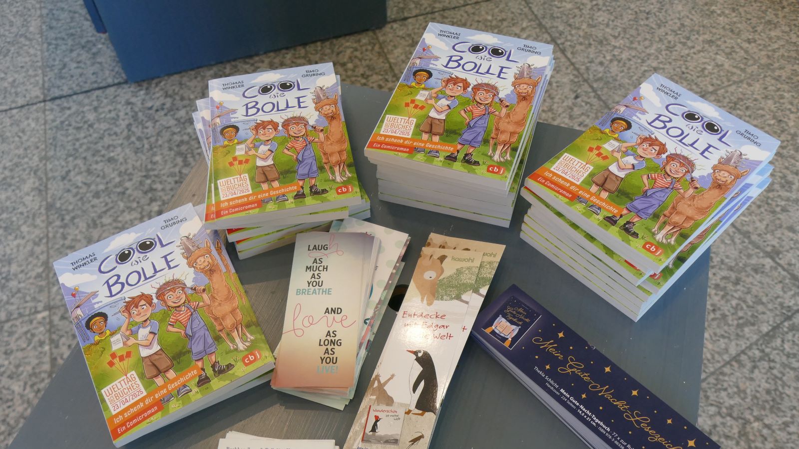 Zum Welttag des Buches gehört die Aktion „Ich schenke dir eine Geschichte“. Jede Schülerin erhält am Ende dieser besonderen Deutsch-Doppelstunde als Buchgeschenk ein Exemplar des Comic-Romans „Cool wie Bolle“, der eigens für die diesjährige Aktion verfasst worden ist. Nicht zuletzt weil zahlreiche humorvolle Illustrationen im Roman für doppelten Lesespaß sorgen, legen die meisten sofort los mit dem Abenteuer: Lesen!