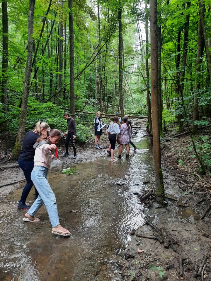 Ein Highlight zum Ende der Orientierungsstufe stellen die Gewässeruntersuchungen an einem der in unserem Tal fließenden Bäche dar. Anhand der Fließgeschwindigkeit, der Wassertemperatur und der Lebewesen im Bach bestimmen die Schülerinnen die Wasserqualität. Besonders groß ist die Freude, wenn ein Feuersalamander, eine Kröte oder mit den Lupen Kleinstlebewesen wie Köcherfliegenlarven, Bachflohkrebse oder Libellen samt ihrer Larven entdeckt werden. Auch die Bestimmung von Bäumen und Wildblumen macht Spaß.