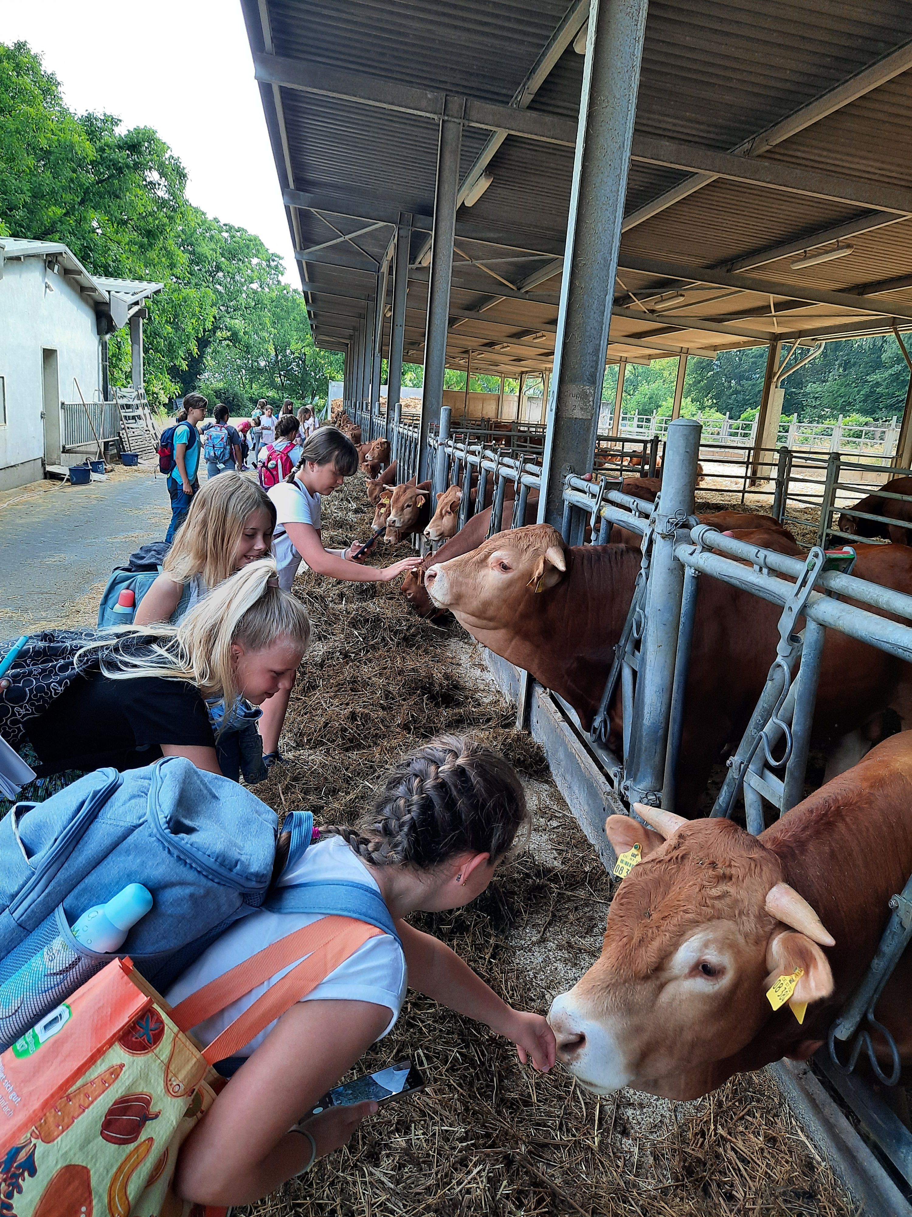 Beim Besuch eines Bioland-Hofs in Maria Lach erarbeiten sich die Schülerinnen die Grundlagen des ökologischen Landbaus und der artgerechten Tierhaltung und erleben mit großer Begeisterung hautnah Schweine, Kühe und Hühner. Jedes Mal sind sie fasziniert, wenn sie ein Huhn auf den Arm nehmen und streicheln oder die Schweine selbst füttern dürfen.