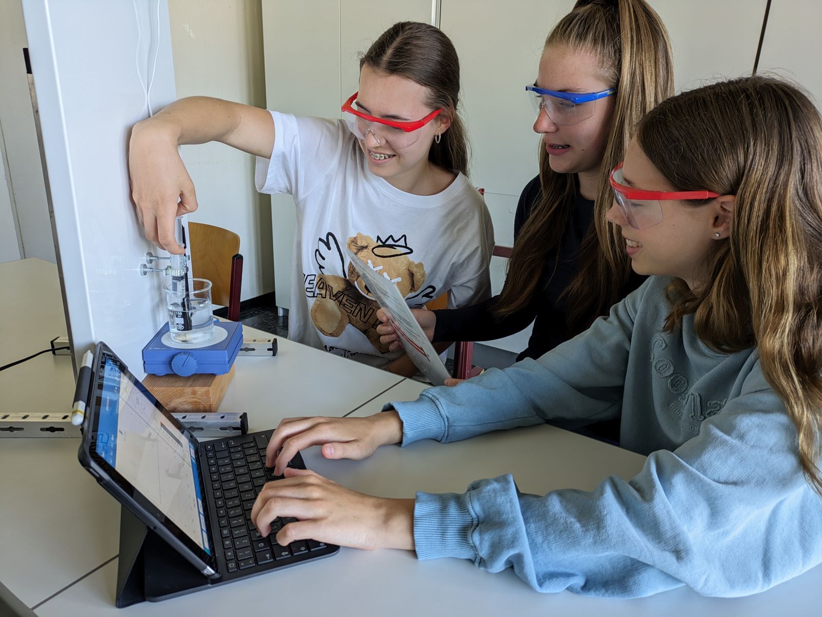 Im Zentrum steht daher das Experiment. Eingebunden in einen problemorientierten Unterricht bietet es die Möglichkeit, naturwissenschaftliche Phänomene zu entdecken oder zu untersuchen. „Nebenbei“ fördert es die Teamfähigkeit, genaues Beobachten und Protokollieren, sowie den sicheren und überlegten Umgang mit Gefahrstoffen und Gasbrenner sowie (digitalen) Geräten.
