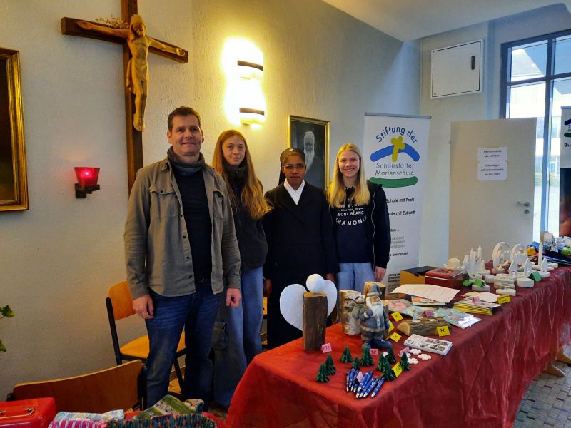 Am Elternsprechtag, 08.11.2024 haben die Schülerinnen der Burundi-AG im Bacheingang der SMS ihren traditionellen Weihnachtsbasar zugunsten unserer Partnerschule ETG aufgebaut. Es wurden Wärmflaschen mit selbstgenähten Bezügen, Weihnachtsdekoration aus Holz, Apfelgelee und weihnachtlicher Schmuck aus Gips und Beton angeboten. Eine große Überraschung war der Besuch von Schwester Maria Yvonne aus Burundi, die aktuell in Schönstatt zu Besuch ist und die Schwesterngemeinschaft in Bujumbura, Burundi leitet. Sie hat sich sehr gefreut über unser Engagement für die ETG in Burundi. Wir wiederum haben uns sehr gefreut, dass unsere Spendengelder vom Frühsommer nach und nach für das wohl der Schülerinnen in Burundi eingesetzt werden konnten. Aktuelle Bilder, die Schwester Maria Yvonne uns mitgebracht hat, zeigen die neuen Fenster und neue Dachbleche für den Schlafsaal. Die Dächer waren löchrig und es regnete dementsprechend ständig auf die Betten. Der Unterricht an der ETG hat nach den großen Sommerferien wieder begonnen und die Schülerinnen sind nach einer Messe am Urheiligtum zur Schule gezogen und freuen sich sehr über die renovierten Internatsräume. Weitere Spenden geben wir Schwester Maria Yvonne im Dezember mit nach Burundi, damit die Dachsanierung weitergehen kann. Durch den Weihnachtsbasar konnten wir bereits über 300 € Verkaufserlös erzielen.