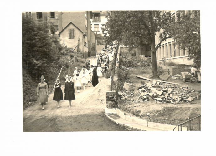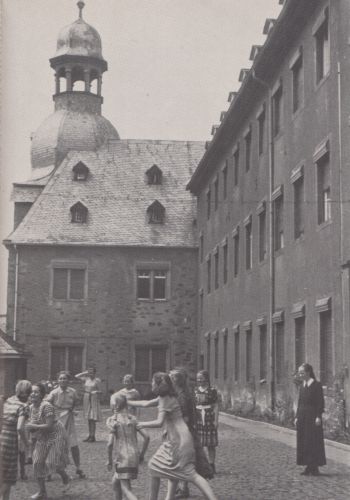 1949 - Ballspiel mit Sr. Salutis auf dem Pausenhof der Wildburg