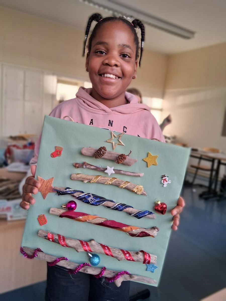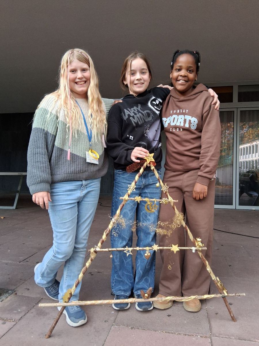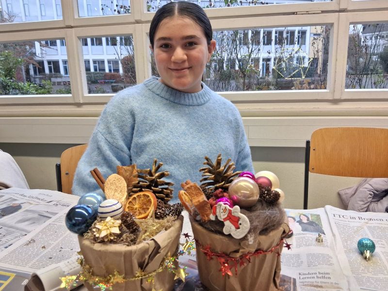 Im Garten der Schule ist ab November alles geerntet und es ist nass und kalt. Für die Garten-AG bedeutet dies, dass alle Aktivitäten nach drinnen verlegt werden. Zum Glück hat die AG einen großen Klassenraum zur Verfügung bekommen in dem man sich zu den vielen Bastelarbeiten ausdehnen kann. Marie-Luise Wenndorf hat immer neue Ideen für die Schülerinnen, wie sich schöne Herbst-Dekos und kleine selbst gebastelte Weihnachtsgeschenke herstellen lassen. Dazu stehen eine Fülle an Bastelmaterialien und zahlreiche Heißklebepistolen zur Verfügung, die besonders beliebt sind, auch wenn die Schülerinnen hier und da mit dem heißen Klebstoff an den Fingern in Berührung kommen. Mit viel Liebe werden die großen Schmuck-Dreiecke aus Haselruten ausgestaltet, da diese als Schmuck für die Schule vorgesehen sind. Zur Begeisterung der Schülerinnen können sie alle anderen Bastelarbeiten als Geschenke mit nach Hause nehmen.