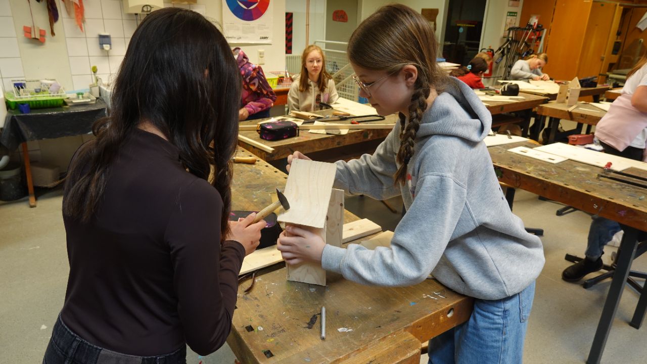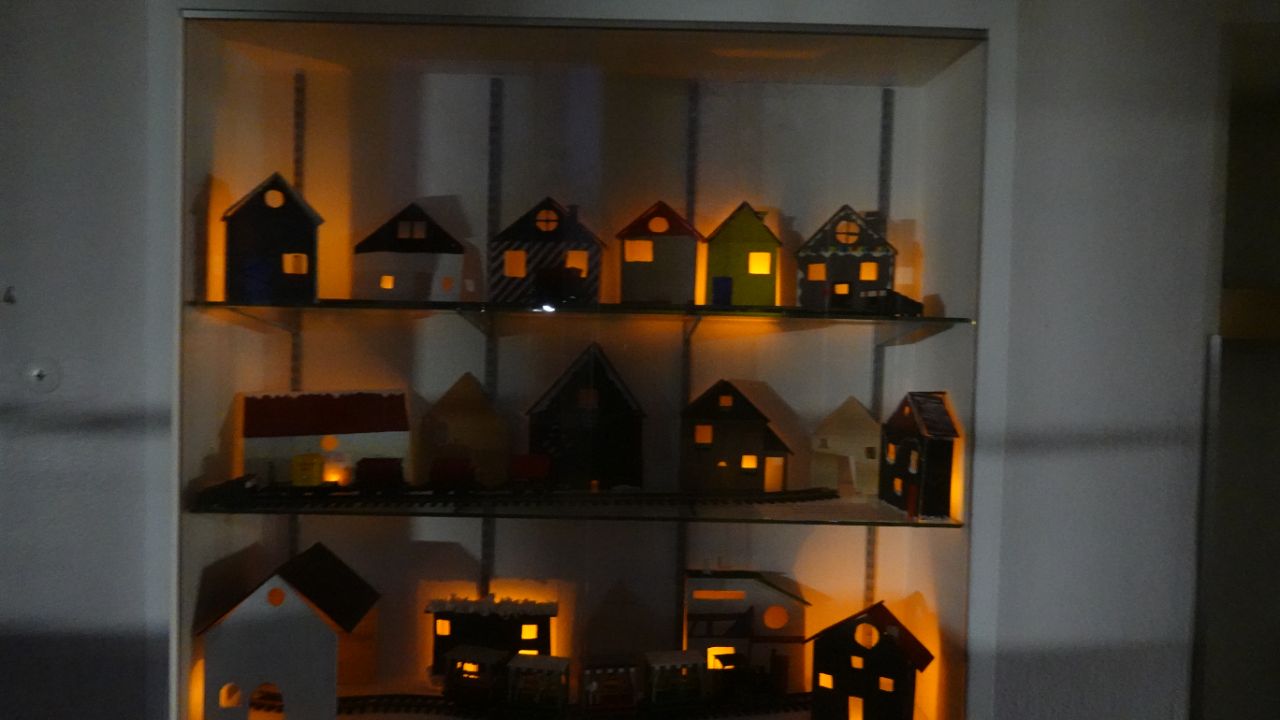 Die 6c und 6d haben in BK bei Frau von Zweydorff eigene Häuser gestaltet, aus Sperrholz ausgesägt und zusammengebaut mit Seitenteilen und Dach und angemalt- größenmäßig passend zur Garteneisenbahn, die dem Dorf Flair und einen Zusammenhalt gibt. Jeden Tag haben wir ein elektrisches Licht mehr angezündet, um die Adventszeit zu feiern.