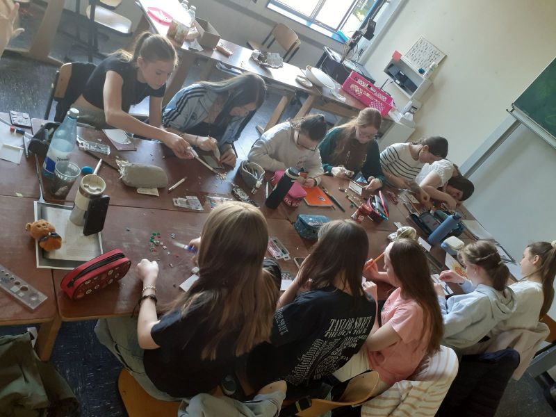 Nicht nur mit dem Würfelspiel beschäftigten sich die Lateinschülerinnen der 8c/d. Einen ganzen Schultag durften sie am 28.04.2026 den Alltag der Römer kennenlernen. Nachdem die Mädchen das Wichtigste über die Essgewohnheiten im alten Rom erfahren hatten, wurde sich beim selbstgestalteten Frühstücksbuffet gestärkt. Im Anschluss daran informierte ihre Lehrerin Frau Weißenfels sie über den römischen Kalender und die Zahlen. Das neu erworbene Wissen konnten sie dann in einem Quiz, das sie durch das ganzen Schulhaus zu einer "Schatzkiste" führte, unter Beweis stellen. Dann lernten die Schülerinnen die verschiedenen Berufe der Menschen im alten Rom kennen. In Anlehnung an die kunstvollen Verzierungen alter Gebäude stellten die Mädchen dann mit viel Geduld und Kunstfertigkeit eigene Mosaikbilder her. Zum Abschluss konnten sie selbst dann bei Pizza Spiele ausprobieren, die die Menschen schon vor 2000 Jahren zum Zeitvertreib spielten. Ein kurzweiliger Tag mit vielen neuen Erkenntnissen!