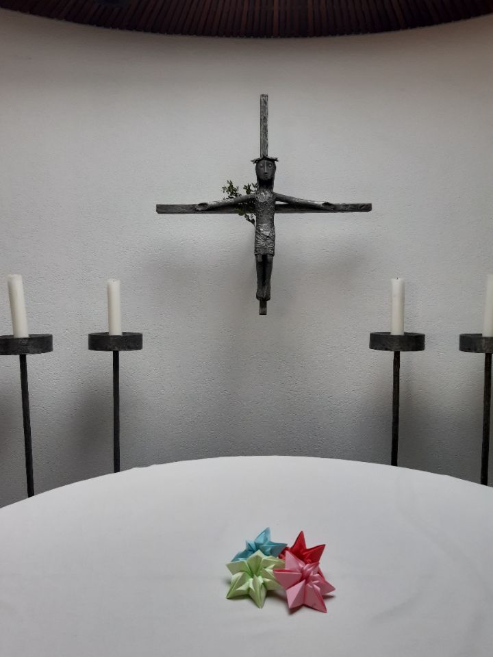Zum Schluss trugen wir unsere Blüten zum Altar vor Gott, damit er uns auf diesem Weg begleiten möge.